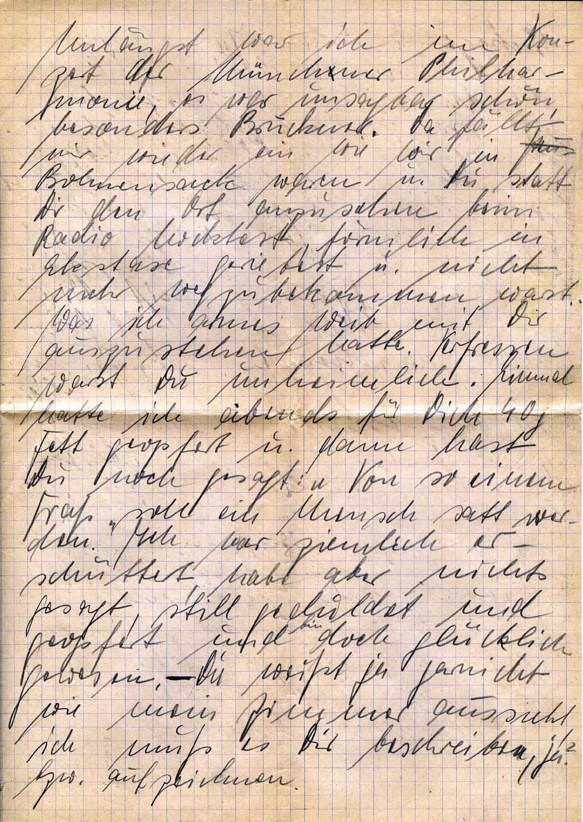 Unlängst war ich im Konzert der Münchner Philharmonie, es war unsagbar schön, besonders Bruckner. Da fällt mir wieder ein, wie wir in Bohnensack (?) waren und Du, statt Dir den Ort anzusehen, beim Radio hocktest und nicht mehr weg zu bekommen warst.. Was ich armes Weib mit Dir auszustehen hatte. Verfressen warst Du unheimlich. Einmal hatte ich abends für Dich 40 g Fett geopfert und dann hast Du noch gesagt: “Von so einem Fraß“ soll ein Mensch satt werden. Ich war ziemlich erschüttert, habe aber nichts gesagt, still geduldet und geopfert und bin doch glücklich gewesen. –