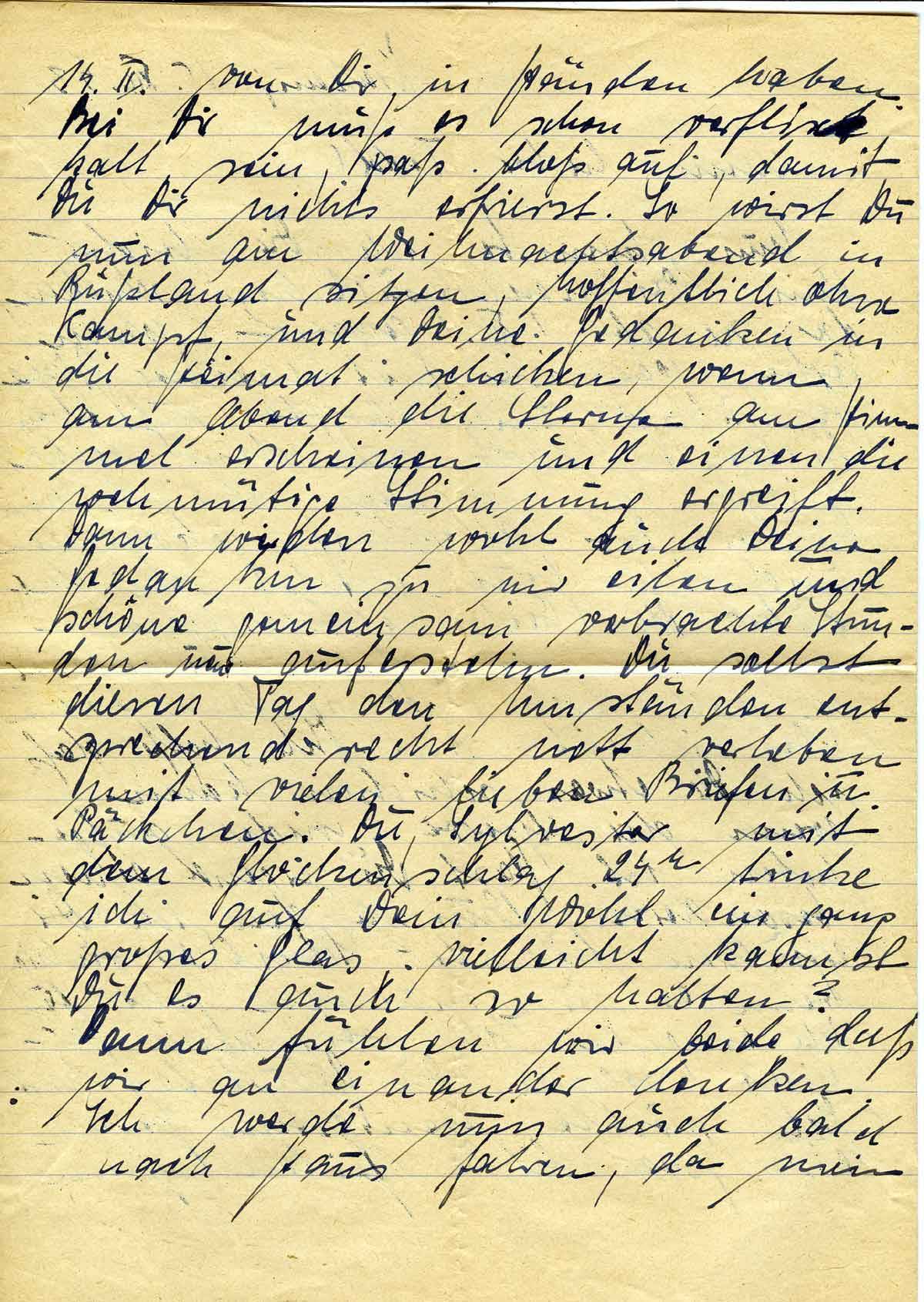 14. 2. von Dir in Händen haben. Bei Dir muss es schon verflixt kalt sein, pass bloß auf, damit Du nicht erfrierst. So wirst Du am Weihnachtsabend in Russland sitzen, hoffentlich ohne Kampf, und Deine Gedanken in die Heimat schicken, wenn am Abend die Sterne am Himmel erscheinen und einen die wehmütige Stimmung ergreift. Dann werden wohl auch Deine Gedanken zu mir eilen und schöne gemeinsam verbrachte Stunden neu auferstehen. Du sollst diesen Tag den Umständen entsprechend nett verleben mit vielen lieben Briefen und Päckchen. Du, Sylvester mit dem Glockenschlag 24 Uhr trinke ich auf Dein Wohl ein ganz großes Glas. Vielleicht kannst Du es auch so halten? Dann fühlen wir beide, dass wir aneinander denken. Ich werde nun auch bald nach Haus fahren, da mein