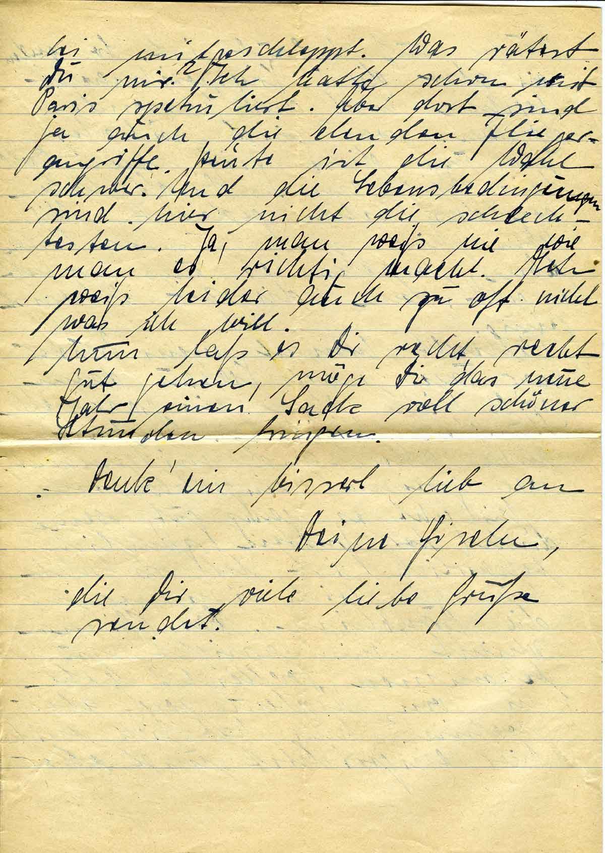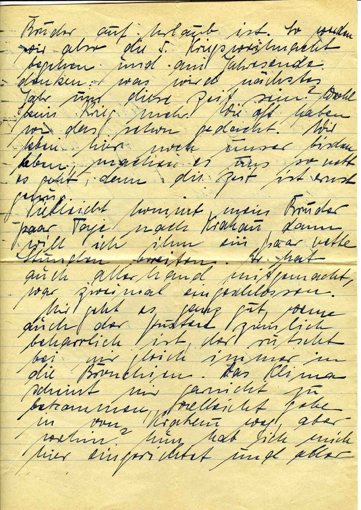 Nun konnte ich Dir leider kein Weihnachtpäckchen schicken, da sie ab 1.12. gesperrt waren. Vorher war ich mit meiner Grippe beschäftigt und hoffte auf eventuellen Urlaub, aus dem wohl nichts zu werden scheint. Mein Bruder ist allerdings gekommen und ich freue mich sehr darüber. Die Weihnachtsgeschenke machen mir großen Kummer, es soll doch wenigstens eine Kleinigkeit sein. Ich hoffe, dass ich Dir etwa schicken kann, wenn die Sperre wieder aufgehoben ist. Hast Du irgendeinen besonderen Wunsch, den ich Dir erfüllen könnte? Schreib es ruhig, wenn es zu machen geht, tue ich es gerne. Ich weiß auch gar nicht, wann Du Geburtstag hast. Ich möchte wenigstens gern ein paar liebe Zeilen zum