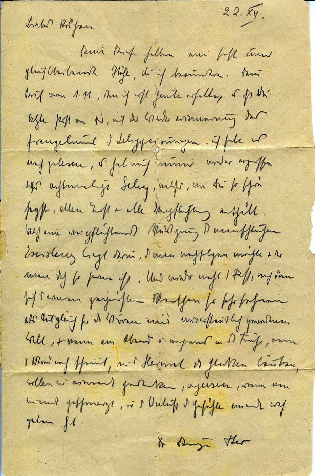 Deine Briefe halten nun fast immer gleichbleibend Höhe, die ich bewundere. Dein Brief vom 1.11., den ich erst heute erhalte, es ist die letzte Post von Dir, mit der Wiedererinnerung des Evangeliums der Seligpreisungen. Ich habe es nachgelesen, es hat mich immer wieder ergriffen, dieses achtmalige Selig, welches, wie Du so schön sagst, allen Trost und alle Verpflichtung enthält. Welch eine verpflichtende Würdigung der menschlichen Existenz liegt darin, der man nachfolgen möchte und der man doch so fern ist.