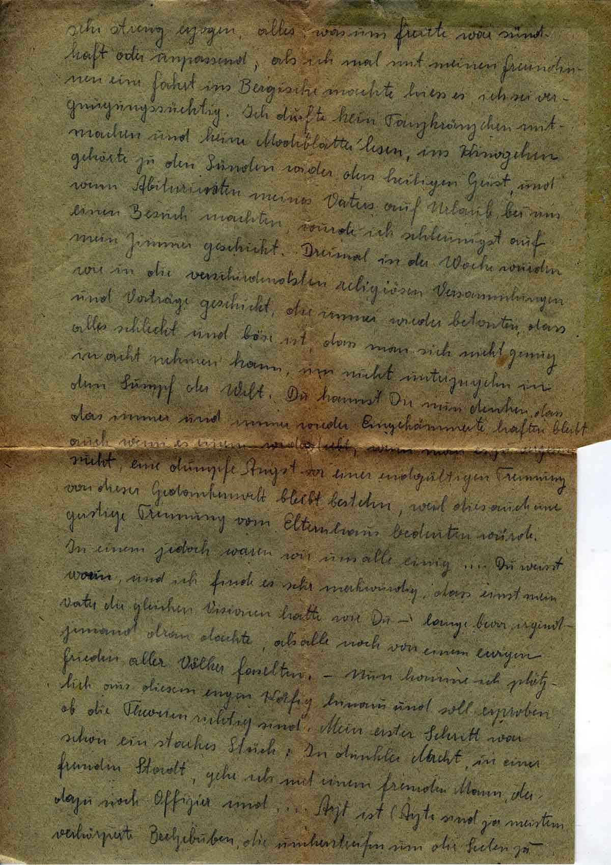 sehr streng erzogen, alles, was uns freute, war sündhaft oder unpassend, als ich mal mit meinen Freundinnen eine Fahrt ins Bergische machte, hieß es, ich sei vergnügungssüchtig. Ich durfte kein Tanzkränzchen mitmachen und keine Modeblätter lesen, ins Kinogehen gehörte zu den Sünden wider den heiligen Geist, und wenn Abiturienten meines Vaters auf Urlaub bei uns einen Besuch machten, wurde ich schleunigst auf mein Zimmer geschickt. Dreimal in der Woche wurden wir in die verschiedensten religiösen Versammlungen geschickt, die immer wieder betonten, dass alles schlecht und böse ist, dass man sich nicht genug in acht nehmen kann, um nicht unterzugehen in dem Sumpf der Welt. Du kannst Dir nun denken, dass das immer und immer wieder Eingehämmerte haften bleibt, auch wenn es einem widerstrebt, wenn man es zu vergessen sucht, eine dumpfe Angst vor einer endgültigen Trennung von dieser Gedankenwelt bleibt bestehen, weil dies auch eine geistige Trennung vom Elternhaus bedeuten würde. In einem jedoch waren wir uns alle einig ...Du weißt worin, und ich finde es sehr merkwürdig, dass einst mein Vater die gleichen Visionen hatte wie Du – lange bevor irgendjemand daran dachte, als alle noch von einem ewigen Frieden aller Völker faselten. –