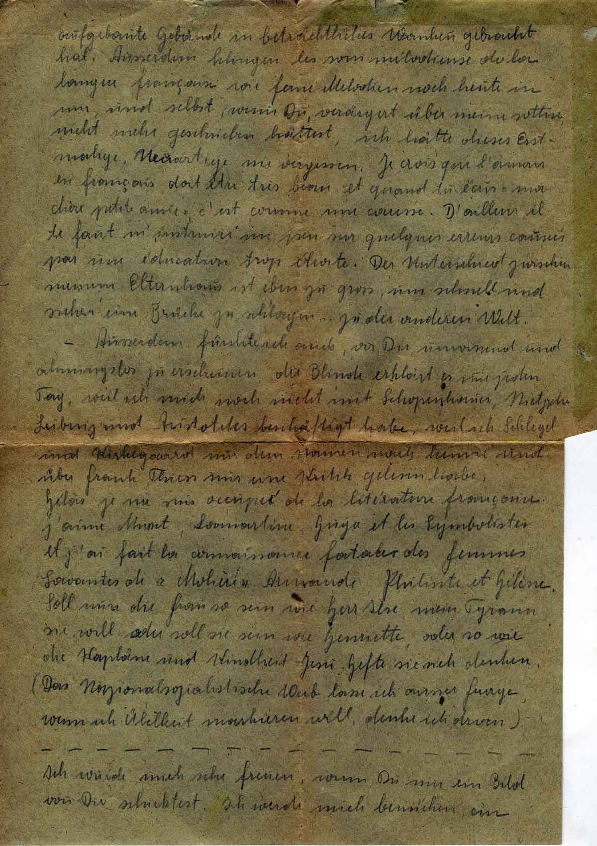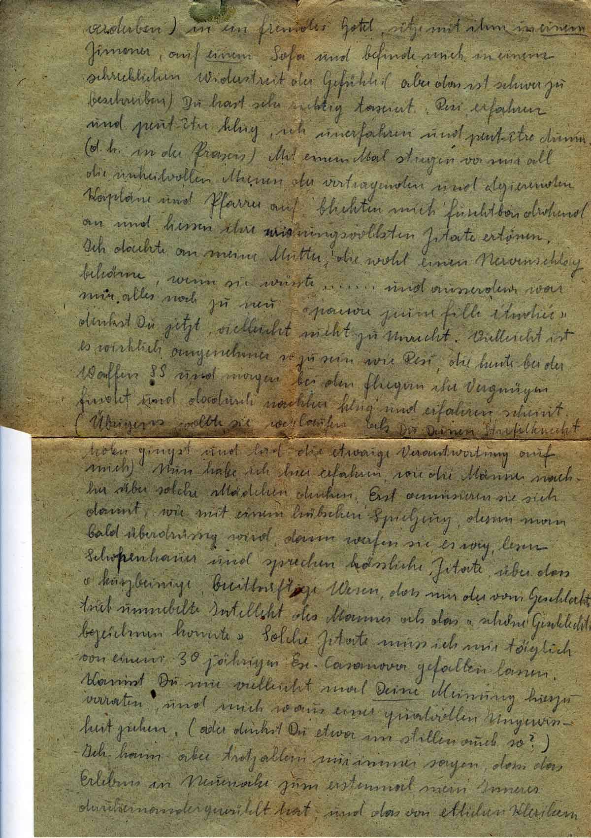 Du hast sehr richtig taxiert: Resi erfahren und vielleicht klug, ich unerfahren und vielleicht dumm (d.h. in der Praxis). Mit einem Mal stiegen vor mir all die unheilvollen Mienen der vortragenden und dozierenden Kapläne und Pfarrer auf, blickten mich furchtbar drohend an und ließen ihre wirkungsvollsten Zitate ertönen. Ich dachte an meine Mutter, die wohl einen Nervenschlag bekäme, wenn sie wüsste...und außerdem war mir alles noch zu neu „pauvre jeune fille etudiée“ denkst Du jetzt vielleicht nicht zu Unrecht. Vielleicht ist es wirklich angenehmer zu sein wie Resi, die heute bei der Waffen SS und morgen bei den Fliegern ihr Vergnügen findet und dadurch nachher klug und erfahren scheint. (Übrigens wollte sie weglaufen als Du Deinen Stiefelknecht holen gingst und lud die etwaige Verantwortung auf mich) Nun habe ich hier erfahren wie die Männer nachher über solche Mädchen denken. Erst amüsieren sie sich damit, wie mit einem hübschen Spielzeug, deren man bald überdrüssig wird, dann werfen sie es weg, lesen Schopenhauer und sprechen hässliche Zitate über das „kurzbeinige, breithüftige Wesen, das nur der vom Geschlechtstrieb umnebelte Intellekt des Mannes als das ‚schöne Geschlecht’ bezeichnen konnte“. Solche Zitate muss ich mir täglich von einem 30jährigen Ex-Casanova gefallen lassen. Kannst Du mir vielleicht Deine Meinung hierzu verraten, und mich so aus einer qualvollen Ungewissheit ziehen. (Oder denkst Du etwa im Stillen auch so?) Ich kann aber trotz allem mir immer sagen, dass das Erlebnis in Neuenahr zum erstenmal mein Inneres durcheinandergewühlt hat, und das von etlichen Klerikern