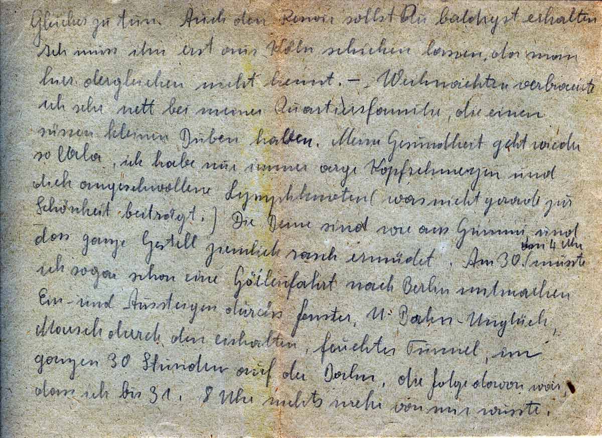 Weihnachten verbrachte ich sehr nett bei meiner Quartiersfamilie, die eine süßen kleine Buben haben. Meine Gesundheit geht wieder so là là, ich habe nur immer arge Kopfschmerzen und dick angeschwollne Lymphknoten (was nicht gerade zur Schönheit beiträgt) Die Beine sind wie aus Gummi und das ganze Gestell ziemlich rasch ermüdet. Am 30. um 4 Uhr musste ich sogar eine Höllenfahrt nach Berlin mitmachen. Ein- und Aussteigen durchs Fenster, U-Bahn Unglück, Marsch durch den eiskalten, feuchten Tunnel, im Ganzen 30 Stunden auf der Bahn, die Folge davon war, dass ich bis 31. 8 Uhr nichts mehr von mir wusste.