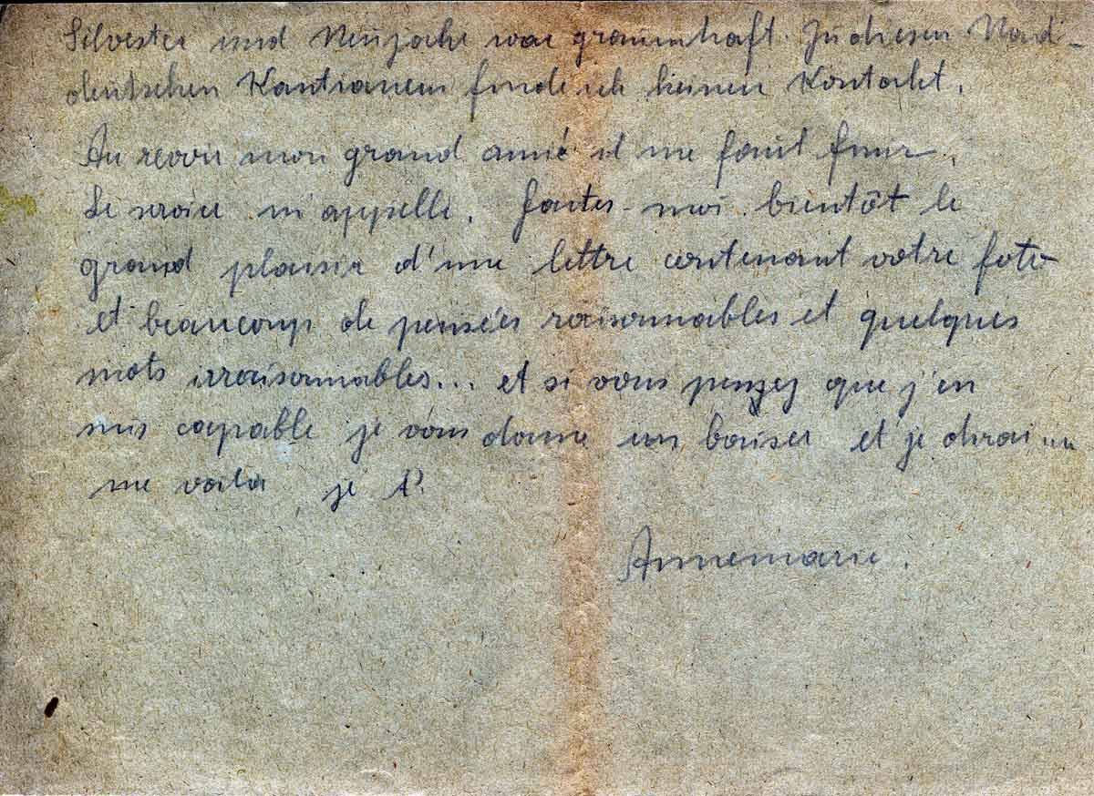 Au revoir mon grand ami il me faut finir. Le service m’appelle. Faites-moi bientôt le grand plaisir d’une lettre contenant votre foto et beaucoup de pensées raisonnables et quelques mots irraisonnables…et si vous pensez que j’en suis capables je vous donne un baiser et je dirai un me voilà je t’..