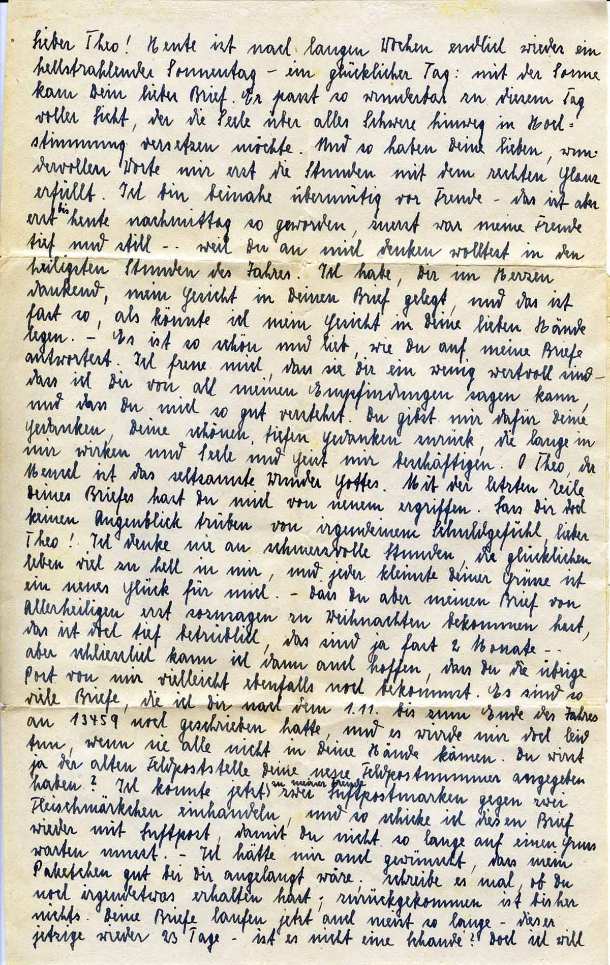 Dass Du aber meinen Brief von Allerheiligen erst sozusagen zu Weihnachten bekommen hast, das ist doch tief betrüblich, das sind ja fast zwei Monate - aber schließlich kann ich dann auch hoffen, dass Du die übrige Post von mir vielleicht ebenfalls noch bekommst. Es sind so viele Briefe, die ich Dir nach dem 1.11. bis zum Ende des Jahres an [Feldpostnummer] 13459 noch geschrieben hatte, und es würde mir doch leid tun, wenn sie alle nicht in Deine Hände kämen. Du wirst ja der alten Feldpoststelle Deine neue Feldpostnummer angegeben haben?