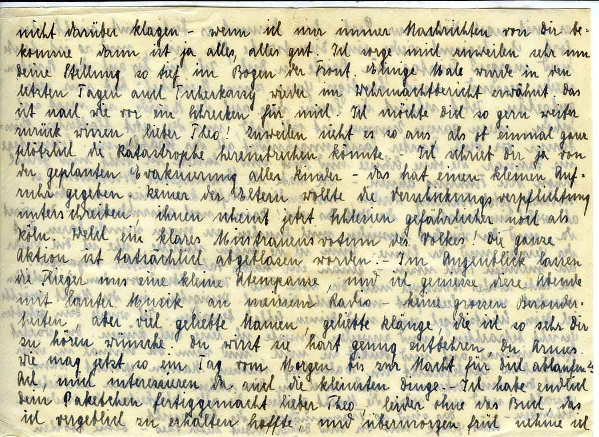 Ich sorge mich zuweilen sehr um Deine Stellung so tief im Bogen der Front. Einige Male wurde in den letzten Tagen auch Tscherkassy wieder im Wehrmachtsbericht erwähnt. Das ist nach wie vor ein Schrecken für mich. Ich möchte Dich so gerne weiter zurück wissen, lieber Theo! Zuweilen sieht es so aus, als ob einmal ganz plötzlich die Katastrophe hereinbrechen könnte. –