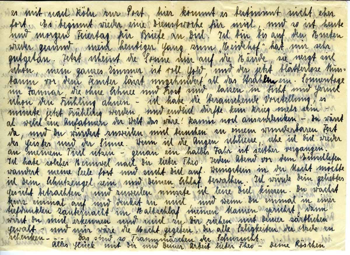 Ich bin bis auf den Husten wieder gesund, mein heutiger Gang zum ‘Heidehof’ hat mir sehr gut getan. Jetzt scheint die Sonne mir auf die Hände, sie neigt sich schon, mein ganzes Zimmer ist voller Gold, und der jetzt blätterlose Nussbaum vor dem Fenster lässt ungehindert all das Strahlen ein. Sonnentage im Januar, die ohne Schnee und Frost sind, lassen in Licht und Geruch schon den Frühling ahnen - ich habe die berauschende Vorstellung, es müsste jetzt Frühling werden, und endlich dürfte kein Krieg mehr sein. - ah welch ein Aufatmen der Welt das wäre! Kaum noch auszudenken - Du wärst da, und Du würdest zuweilen mich besuchen zu einem wunderbaren Fest des Geistes und der Sinne.