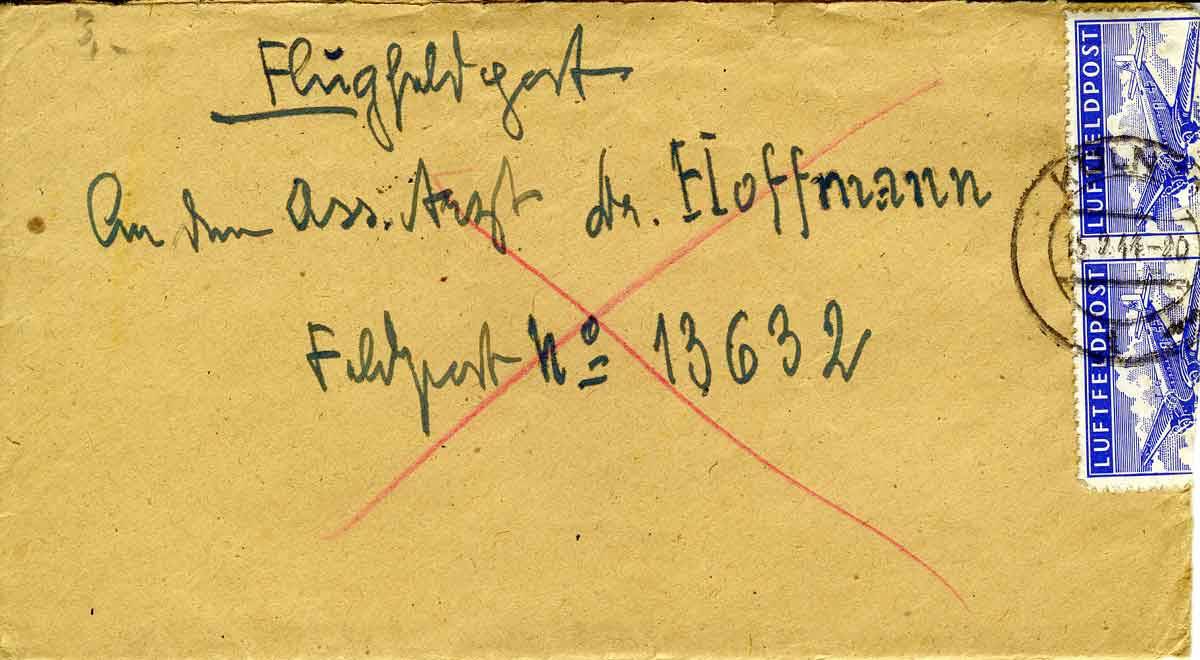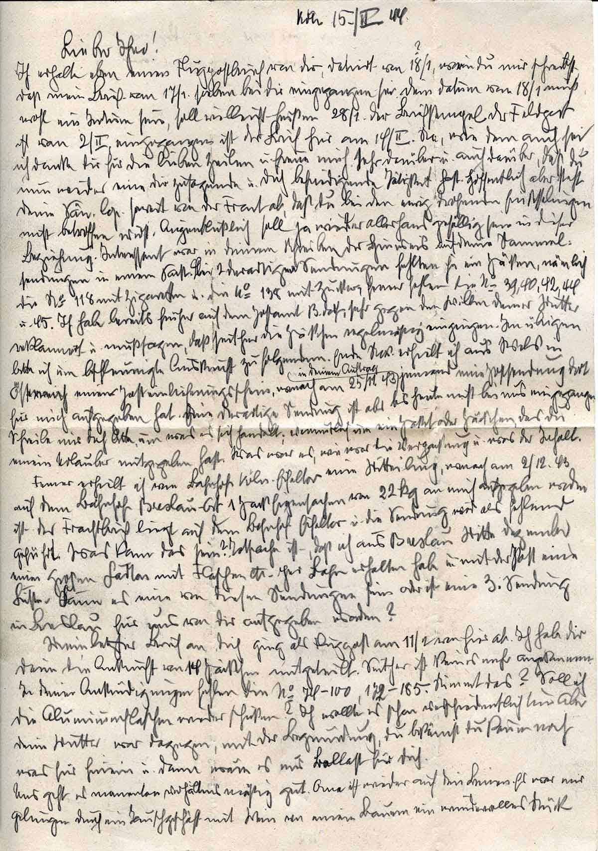 Ich erhalte eben einen Flugpostbrief von dir, datiert 18/1. ? , worin Du mir schreibst, dass mein Brief vom 17/1. Soeben bei dir eingegangen sei. Dein Datum vom 18/1 muss wohl ein Irrtum sein , soll vielleicht heißen 28/1. Der Briefstempel der Feldpost ist vom 2.2., eingegangen ist der Brief hier am 14.2. Na, wie dem auch sei, ich danke Dir für die lieben Zeilen u. freue mich sehr darüber u. auch darüber, dass Du nun wieder eine Dir zusagende u. Dich befriedigende Tätigkeit hast. Hoffentlich aber steht Deine San.Kp. (Sanitätskompanie) soweit von der Front ab, dass Du bei den ewig drohenden Einkesselungen nicht betroffen wirst. Augenblicklich soll ja wieder allerhand gefällig sein in dieser Beziehung. Interessant war in Deinem Schreiben der Hinweis auf Deine Sammelsendungen in einem Sack. In 2 derartigen Sendungen fehlten je 1 Päckchen, nämlich die Nr. 118 mit Zigaretten und die Nr. 138 mit Zucker, ferner fehlen die Nr. 39, 40, 42, 44 u. 45. Ich habe bereits früher auf dem Postamt B.dorf (Buschdorf), sehr gegen den Willen Deiner Mutter reklamiert u. muss sagen, dass seither die Päckchen regelmäßig eingingen. Im Übrigen bitte ich um beschleunigte Auskunft zu folgendem. Ende Nov. Erhielt ich aus Wals in Österreich einen Posteinlieferungsschein, wonach am 25.11.43 in Deinem Auftrag jemand eine Postsendung dort für mich aufgegeben hat. Eine derartige Sendung ist aber bis heute nicht bei uns eingegangen. Schreibe mir doch bitte, um was es sich handelt. Vermutlich um ein Paket oder Päckchen, das Du einem Urlauber mitgegeben hast. Was war es, wie war die Verpackung u. was der Inhalt. Ferner erhielt ich vom Bahnhof Köln- Eifeltor eine Mitteilung, wonach am 2./12.43 auf dem Bahnhof Breslau-Ost 1 (?)von 22 kg an mich aufgegeben worden ist. Der Frachtbrief liegt auf dem Bahnhof Eifeltor u. die Sendung wird als fehlend geführt. Was kann das sein? Tatsache ist - , dass ich aus Breslau Mitte Dezember einen großen Karton Flaschen etc. per Bahn erhalten habe u. mit der Post eine Kiste . Kann es eine von diesen Sendungen sein oder ist eine 3. Sendung in Breslau für uns von Dir aufgegeben worden?