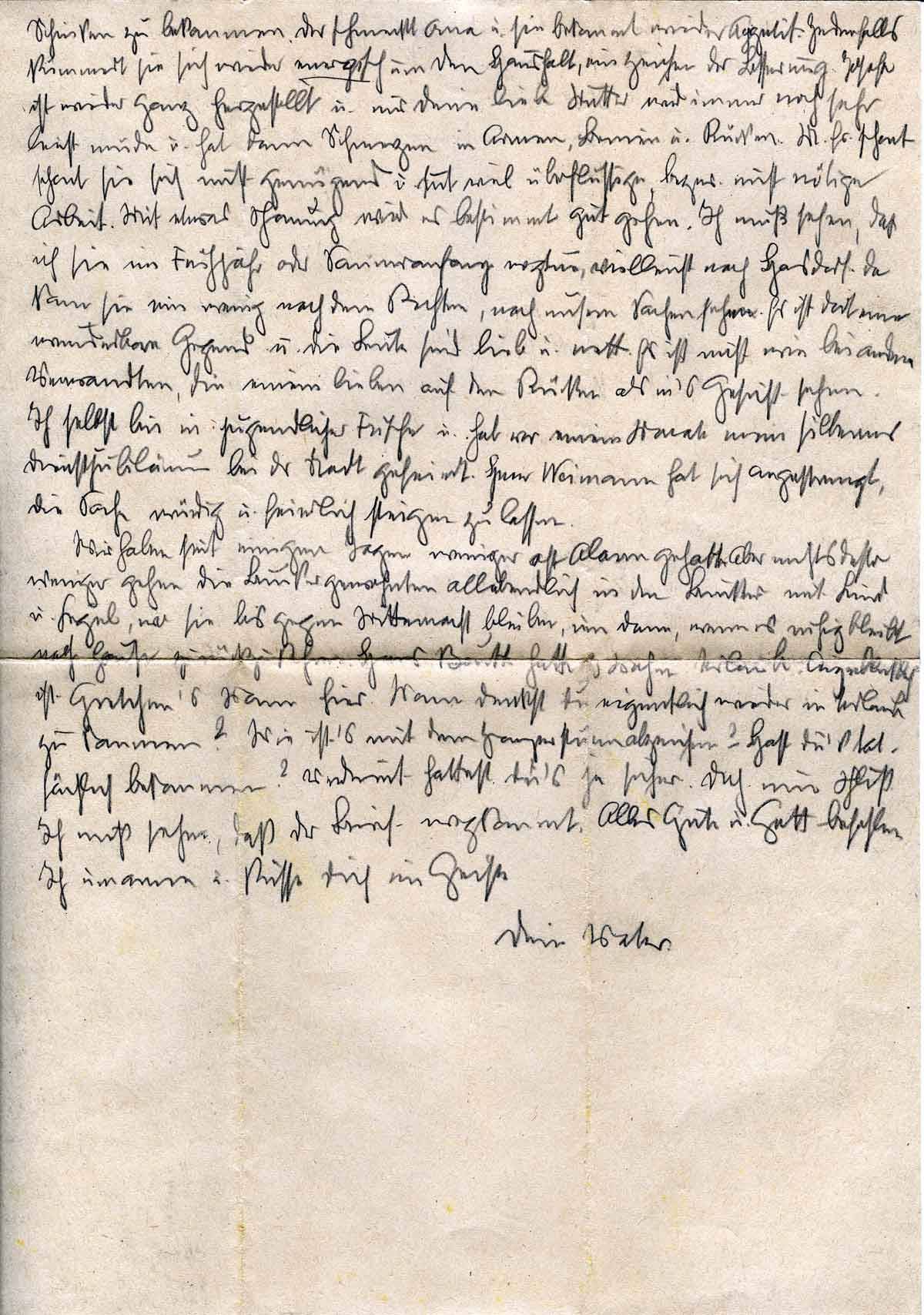 Wann denkst Du eigentlich wieder in Urlaub zu kommen? Wie ist es mit dem Tapferkeitsabzeichen? Hast Du’s tatsächlich bekommen? Verdient hattest Du’s ja sicher. Das zum Schluss. Ich muss sehen, dass der Brief wegkommt. Alles Gute und Gott befohlen. Ich umarme und küsse dich im Geiste
