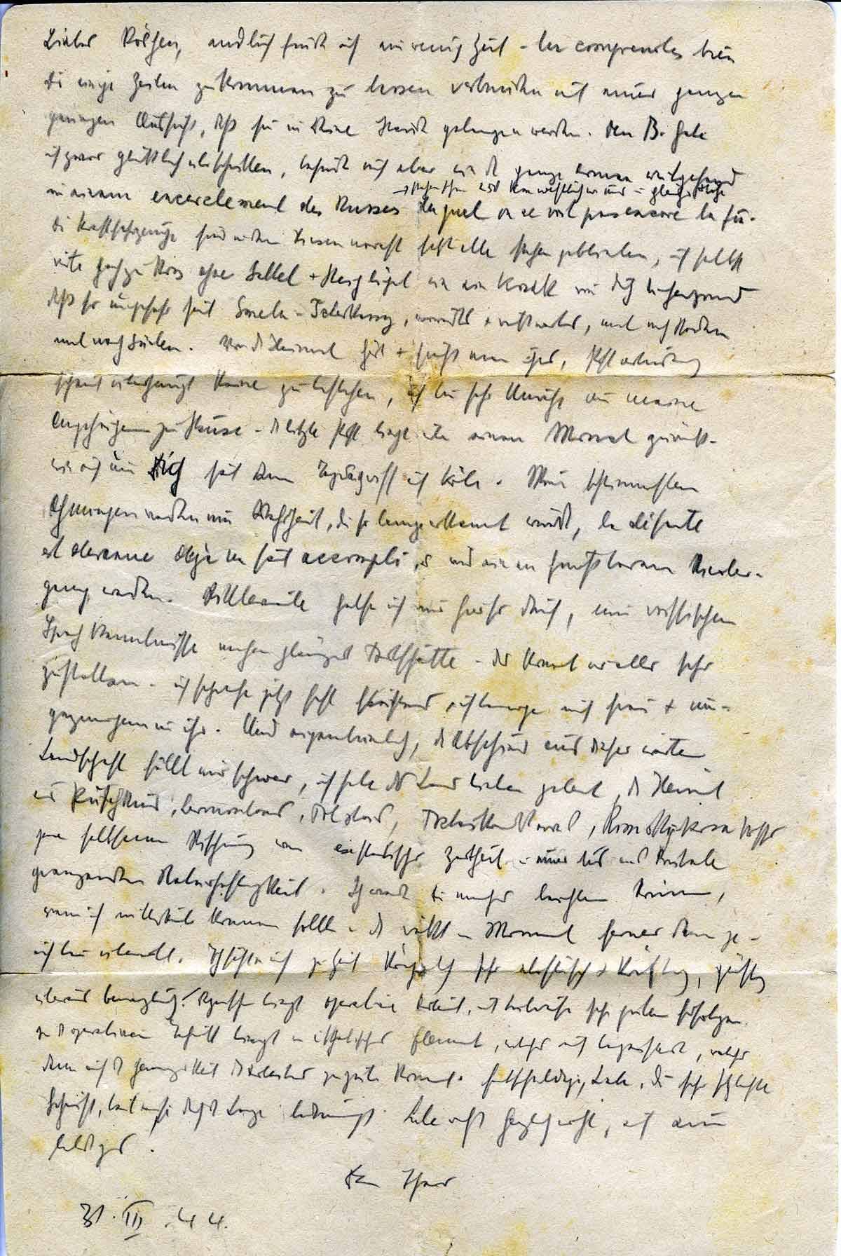 Die Kraftfahrzeuge sind wieder in diesem Morast fast alle stehen geblieben, ich selbst reite hoch zu Ross ohne Sattel und Steigbügel wie ein Kosake nun durch Tiefengrund, das so ungefähr seit Smola [?] – Tscherkassy, vorwärts und rückwärts, mal nach Norden, mal nach Süden. Von der Heimat hört und sieht man nichts, Postverbindung scheint überhaupt keine zu bestehen, ich bin in großer Unruhe um meine Angehörigen zu Hause - die letzte Post liegt schon einen Monat zurück – wie auch um Dich seit dem Tagesangriff auf Köln. Meine schlimmsten Ahnungen werden nun Wahrheit, die so lange erkannt wird, la défaite est devenu déjà un fait accompli es wird ein furchtbarer Niedergang werden.