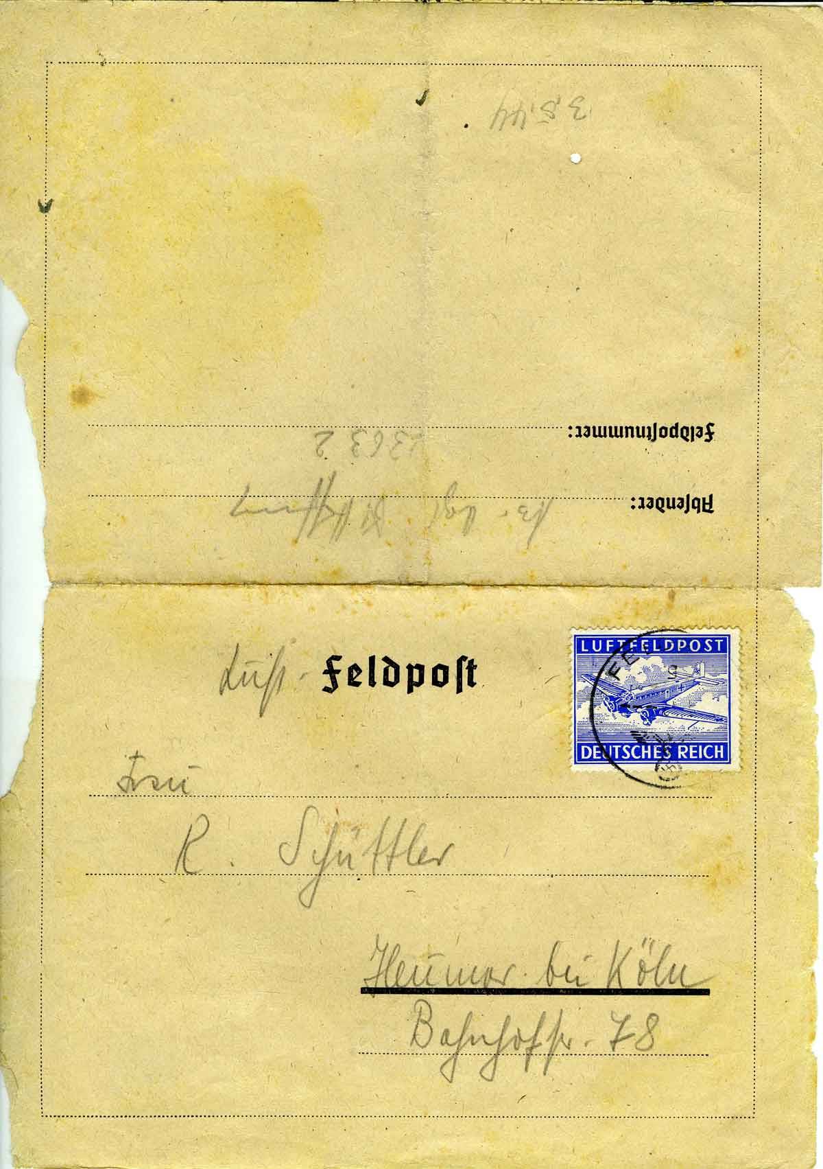 hab Dank für Deinen Luftpostbrief, der mich über so manches beruhigt hat. Er traf nach zehn Tagen Laufzeit ein. Zugleich damit bekam ich auch Nachrichten von meinen Eltern, sie trafen mich wie Hammerschläge; ich war aber doch glücklich darüber, sie relativ gut bewahrt zu wissen, meine Lieben zu Hause. Besonders schmerzlich empfinde ich es für meine Mutter und Großmutter, dauernd diesem Schrecken ausgesetzt zu sein, sie werden allmählich gesundheitlich zugrunde gehen müssen. Und diese Angriffe werden auch auf Köln nicht nachlassen, besonders angesichts der drohenden Invasion. Ich werde alle Hebel in Bewegung setzen, bald auf Urlaub zu kommen und es wird unter diesen Umständen sicher kein großes Vergnügen werden.