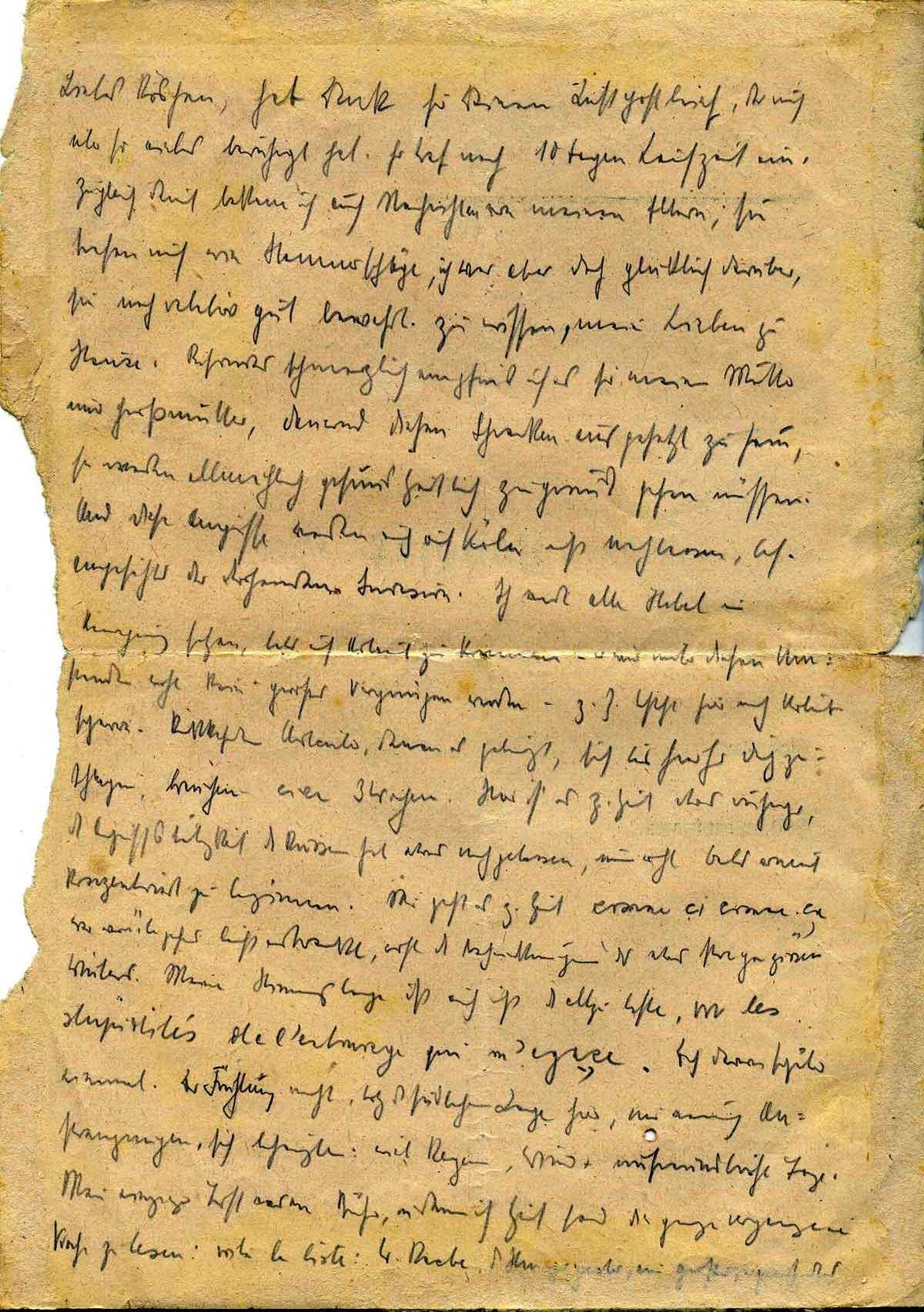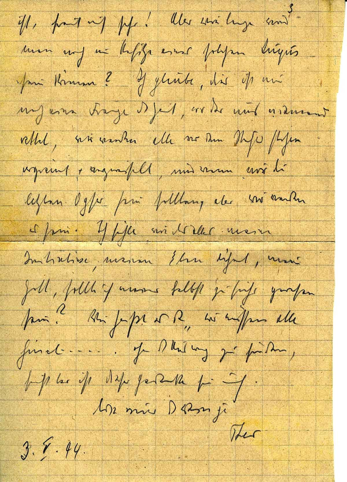 ist, freut mich sehr! Aber wie lange wird man noch im Besitze eines solchen Luxus sein können? Ich glaube dies ist nur noch eine Frage der Zeit, vor der uns niemand rettet, wir werden alle vor dem Nichts stehen, ergraut und [---], und wenn wir die letzten Opfer sein sollten, aber wir werden es sein. Ich fühle wie das alles meine Initiative, meinen Elan lähmt. Mein Gott, soll ich meiner selbst zu sicher gewesen sein?