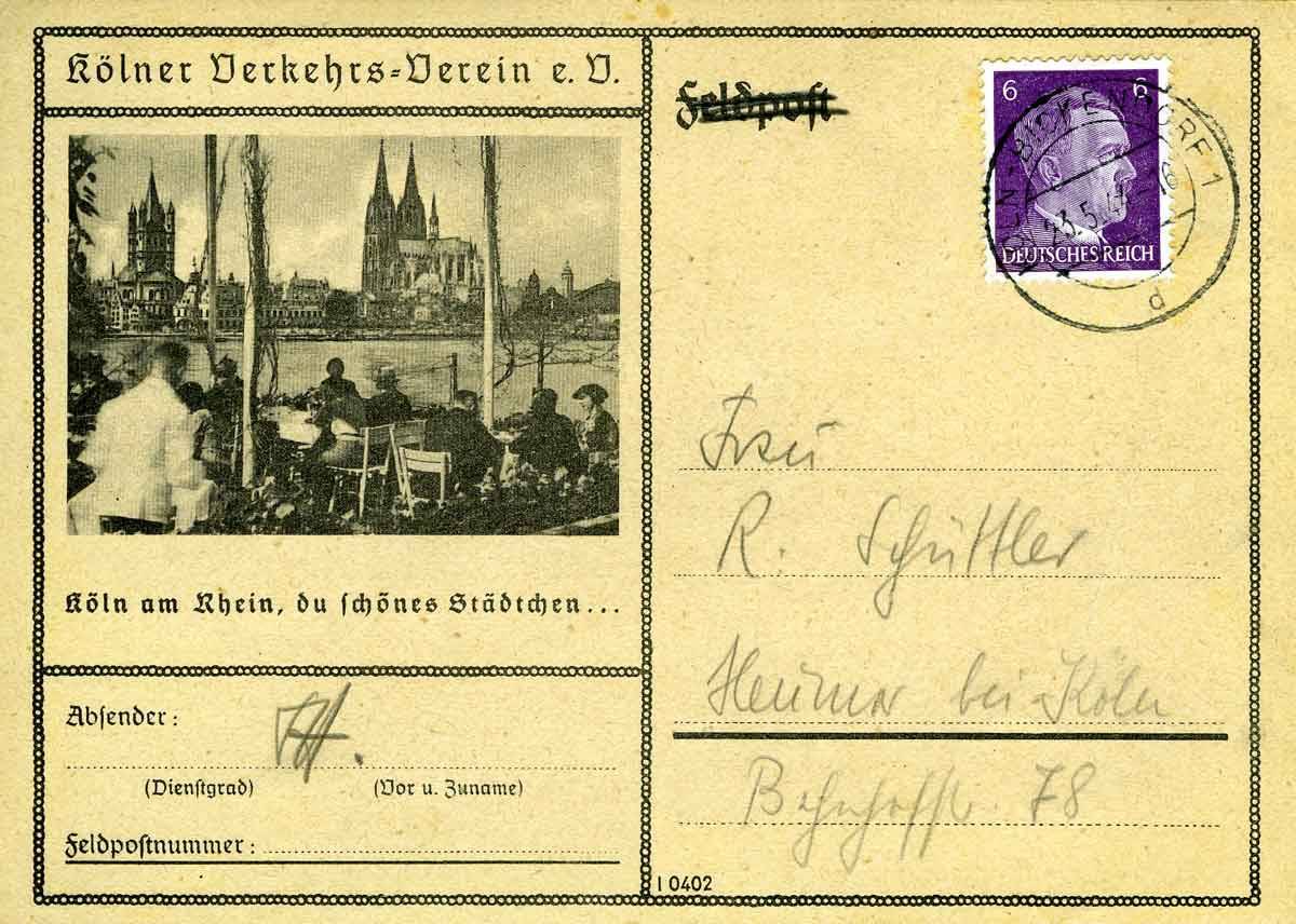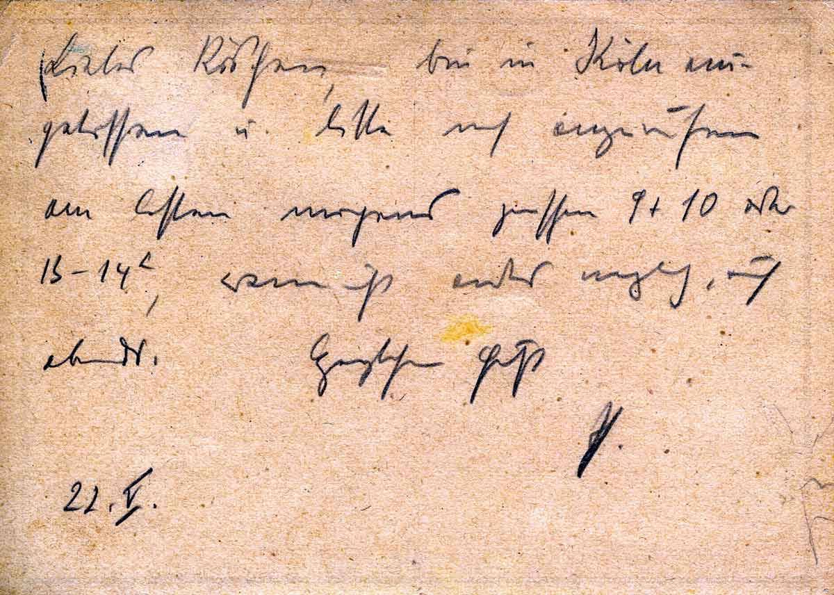 Theo Hoffmann an Freundin Rosalie Schüttler, 22. Mai 1944 Liebes Röschen, bin in Köln eingetroffen und bitte mich anzurufen am besten morgens zwischen 9-10 oder 13-14 Uhr, wenn nicht anders möglich, auch abends Herzlichen Gruß Theo 22.5.44