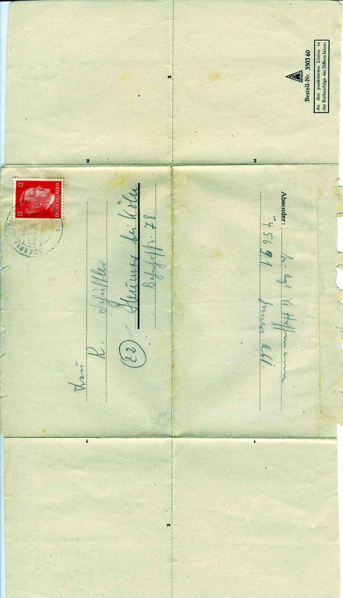 ich habe nun seit vier Wochen keine Post von Dir empfangen. Ich möchte Dir schnell einige Zeilen zukommen lassen: vielleicht, dass es Dir möglich ist, noch postwendend an die Feldpostnummer 45691 zu schreiben, bevor ich hier wieder das Feld räumen muss.