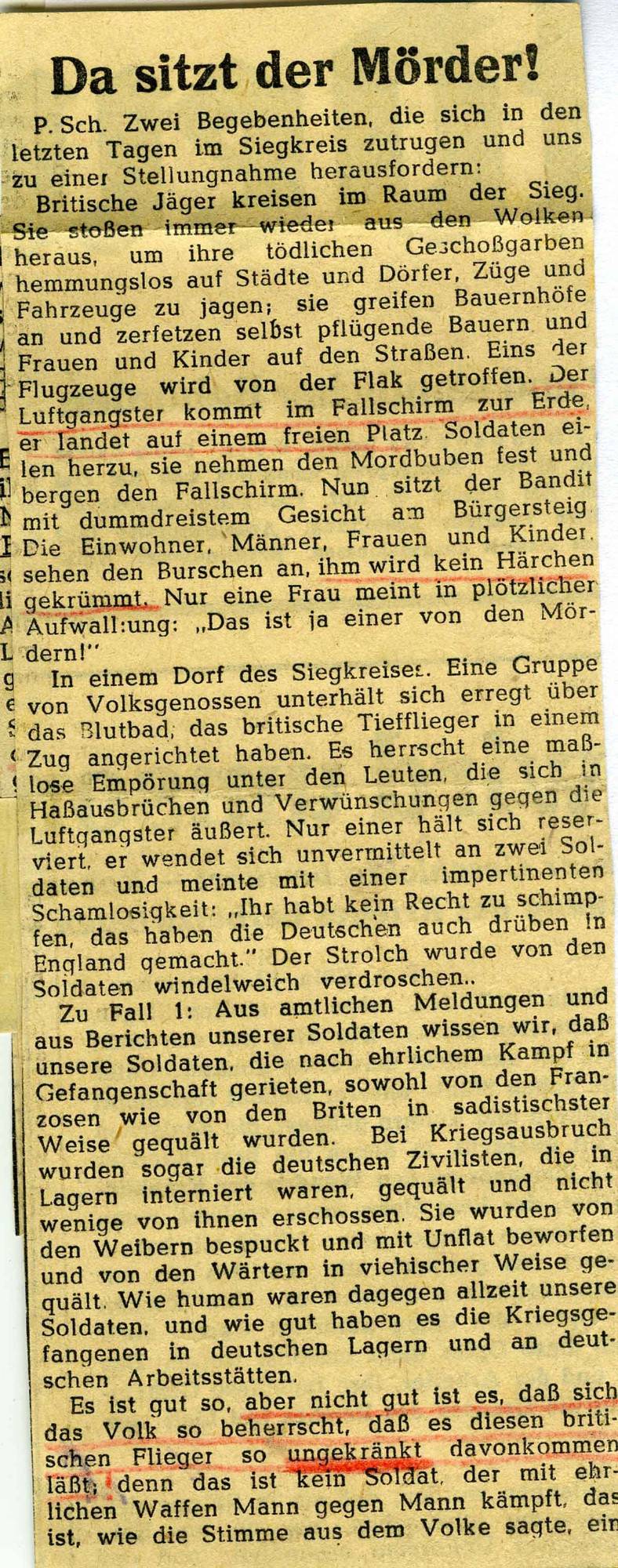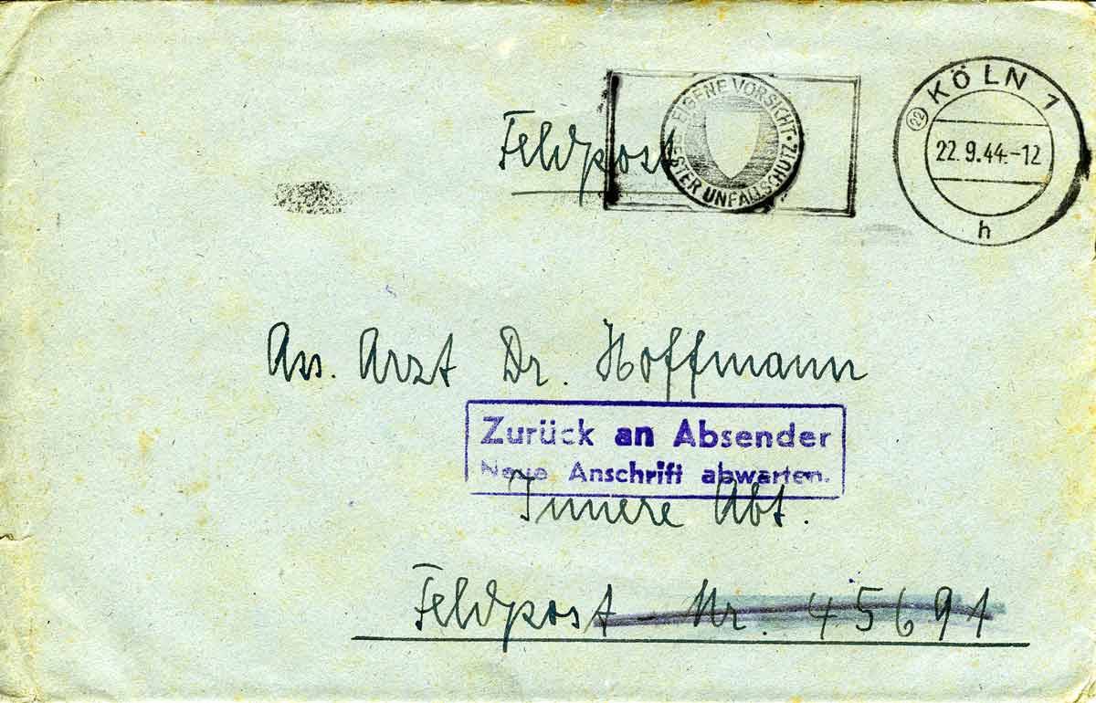 Ach, lieber Theo, was ist doch der Mensch ein armes, kleines Geschöpf in diesen Tagen. Viele sind fluchtbereit bei gepackten Koffern, aber weitaus die meisten wollen nicht fort. Man hört hier und da, Köln solle zur offenen Stadt erklärt werden, doch das wird ein allgemeiner Wunsch der Bevölkerung sein, auf den letzten Endes ja keine Rücksicht genommen wird. Ich habe nur die Hoffnung, dass entweder alles einmal zu plötzlich kommen wird, oder dass man nicht mehr weiß, wohin mit all diesen Hunderttausenden, die Köln immer noch hat. Wie es allerdings in jedem Fall hier auf der rechten Rheinseite wird, das wissen immer noch nur die Götter. Zu viel ist hier, was mir nicht gefällt. Ein Bauer von hier, der aber schon vor dem Krieg nach Overath übergesiedelt war, soll dort den Bescheid bekommen haben: wenn der Befehl zu räumen an ihn erginge, hätte er sofort zu folgen und Haus und Hof in Brand zu stecken! Und aus den Grenzorten und den Dörfern vor Köln hört man allgemein,