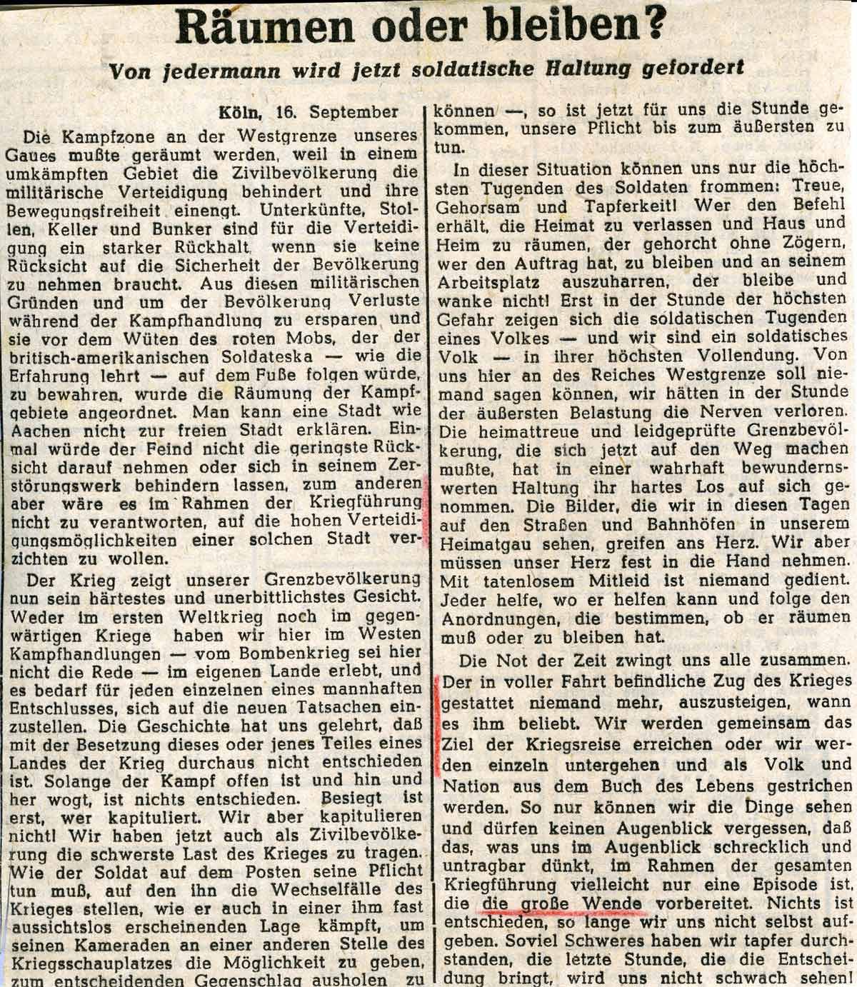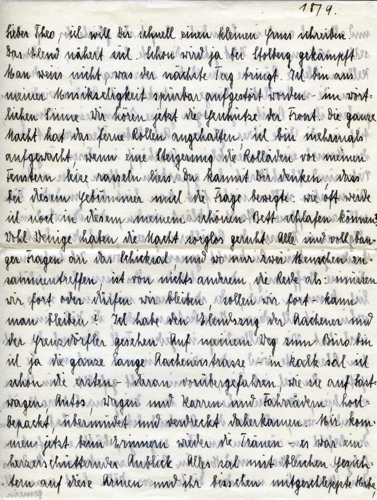 ich will Dir noch schnell einen kleinen Gruß schreiben. Das Elend nähert sich. Schon wird ja bei Stolberg gekämpft. Man weiß nicht, was der nächste Tag bringt. Ich bin aus meiner Musikseligkeit spürbar aufgestört worden – im wörtlichen Sinne. Wir hören jetzt die Geschütze der Front. Die ganze Nacht hat das ferne Rollen angehalten; ich bin mehrmals aufgewacht, wenn eine Steigerung die Rolladen vor meinem Fenster leise rasseln ließ. Du kannst Dir denken, dass bei diesem Gebummer mich die Frage bewegte: wie oft werde ich noch in diesem meinem schönen Bett schlafen können? Wohl wenige haben die Nacht sorglos geruht. Alle sind voll banger Fragen an das Schicksal, und wo nur zwei Menschen zusammentreffen, ist von nichts anderem die Rede als: müssen wir fort oder dürfen wir bleiben, sollen wir fort – kann man bleiben? Ich habe den Elendszug der Aachener und der Grenzdörfler gesehen. Auf meinem Weg zum Büro bin ich ja die ganze lange Aachenerstrasse – in Kalk sah ich schon die ersten – daran vorübergefahren, wie sie auf Lastwagen, Autos, Wagen und Karren und Fahrrädern, hochbepackt, übermüdet und verdreckt daherkamen. Mir kommen jetzt beim Erinnern wieder die Tränen – es war ein herzerschütternder Anblick. Alles sah mit bleichen Gesichtern auf diese Armen und ihr bisschen mitgeschleppter Habe
