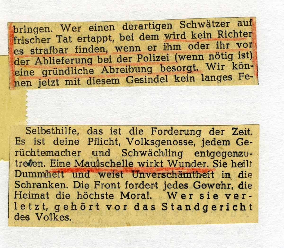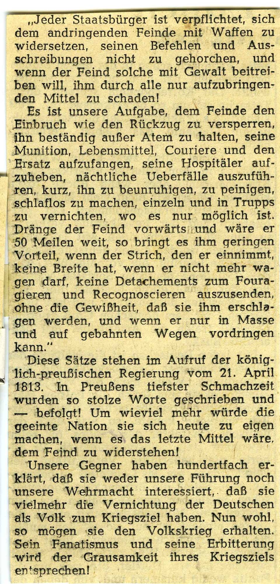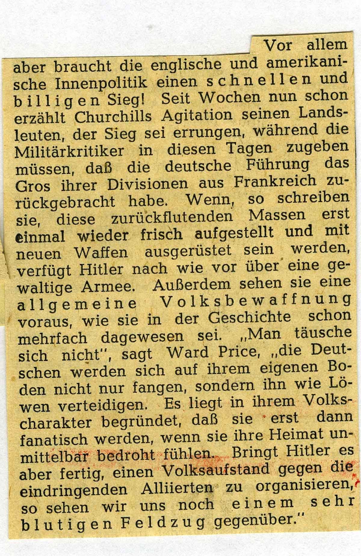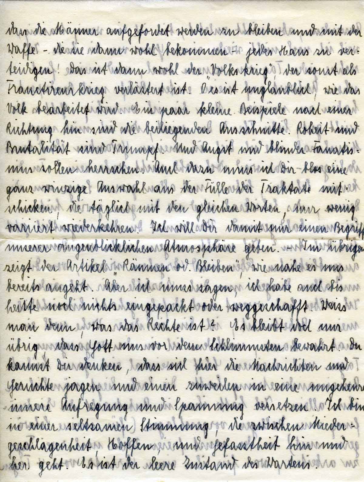 dass die Männer aufgefordert werden zu bleiben und mit der Waffe – die sie dann wohl bekommen – jedes Haus zu verteidigen! Das ist dann wohl der „Volkskrieg“, der sonst als Franctireur-Krieg ( Freischärler ) verlästert wird. O es ist unglaublich, wie das Volk bearbeitet wird. Ein paar kleine Beispiele nach einer Richtung hin sind die beiliegenden Zeitungs-Ausschnitte. Rohheit und Brutalität sind Trumpf. Und Angst und blinder Fatalismus sollen herrschen. Auch dazu muss ich Dir bloß eine ganz winzige Auswahl aus der Fülle der Traktate mitschicken, die täglich mit den gleichen Worten, nur wenig variiert wiederkehren. Ich will Dir damit nur einen Begriff unserer augenblicklichen Atmosphäre geben. – Im übrigen zeigt der Artikel „Räumen oder bleiben“, wie nahe es uns bereits angeht. Aber ich muss sagen, ich habe auch bis heute noch nichts eingepackt oder weggeschafft. Weiß man denn, was das Rechte ist? Es bleibt doch nur übrig, dass Gott uns vor dem Schlimmsten bewahrt. Du kannst Dir denken, dass sich hier die Nachrichten und Gerüchte jagen und einen zuweilen in eine ungeheuere innere Aufregung und Anspannung versetzten. Ich bin in einer seltsamen Stimmung, die zwischen Niedergeschlagenheit, Hoffen und Gefasstheit hin und her geht. Es ist der leere Zustand des Wartens.
