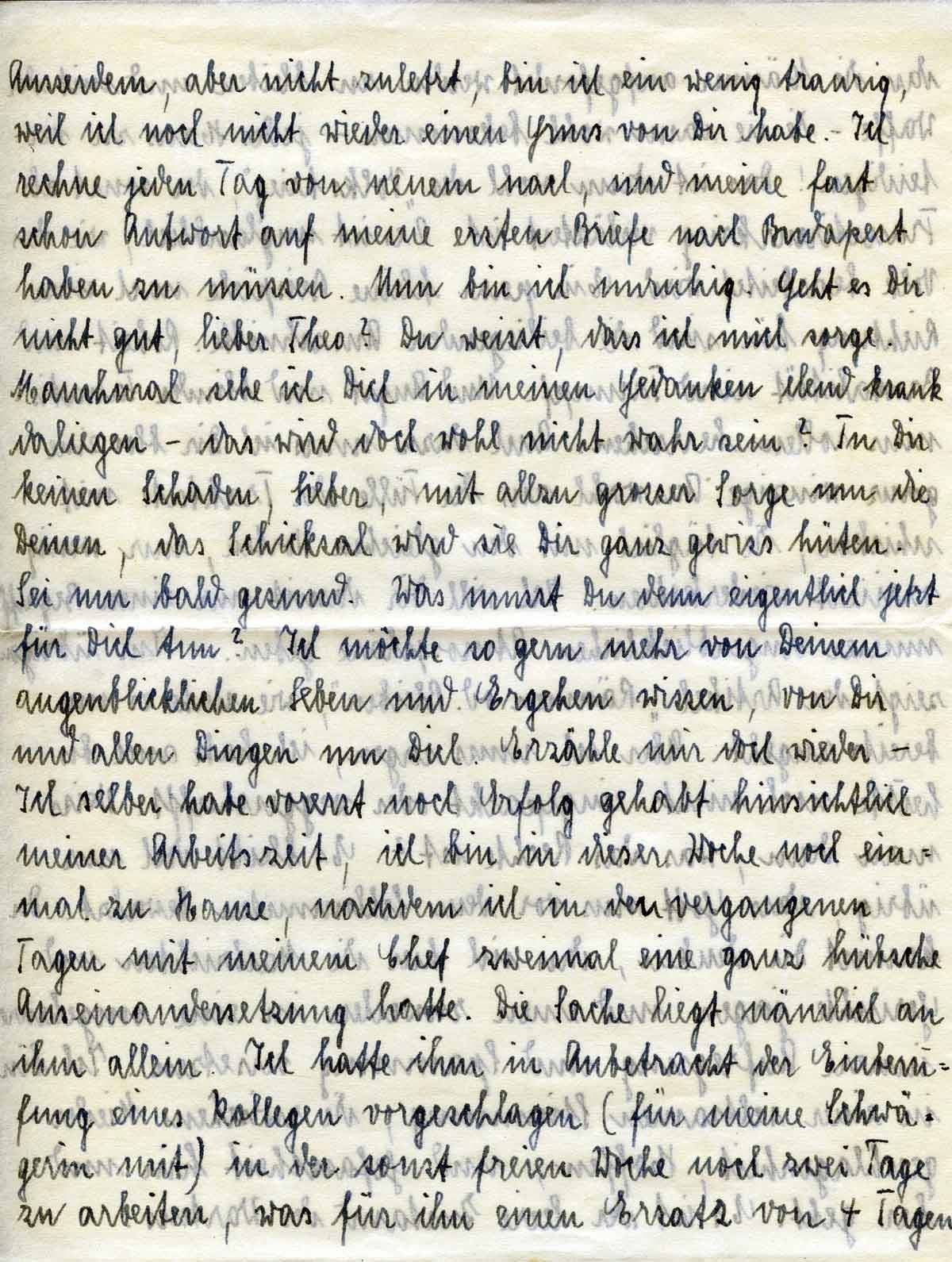 Außerdem, aber nicht zuletzt, bin ich ein wenig traurig, weil ich noch nicht wieder einen Gruß von Dir habe. Ich rechne jeden Tag von neuem nach, und meine, fast schon Antwort auf meine ersten Briefe nach Budapest haben zu müssen. Nun bin ich unruhig. Geht es Dir nicht gut, lieber Theo? Du weißt, das ich mich sorge. Manchmal sehe ich Dich in meinen Gedanken elend krank daliegen – das wird doch wohl nicht wahr sein? Tu Dir keinen Schaden, Lieber, mit allzu großer Sorge um die Deinen, das Schicksal wird sie Dir ganz gewiss hüten. Sei nur bald gesund. Was musst Du denn jetzt eigentlich für Dich tun? Ich möchte so gern mehr von Deinem augenblicklichen Leben und Ergehen wissen, von Dir und allen Dingen um Dich. Erzähle mir doch wieder - .