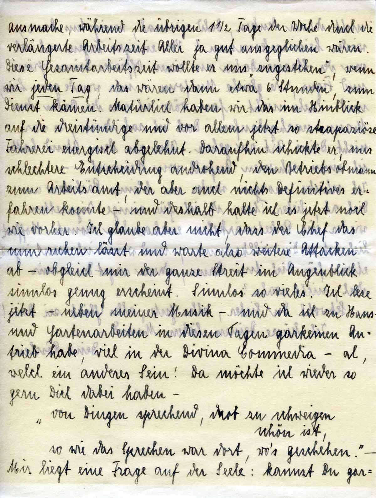 Ich lese jetzt – neben meiner Musik – und da ich zu Haus- und Gartenarbeiten in diesen Tagen gar keinen Antrieb habe, viel in der Divina Commedia - ah, welch ein anderes Sein! Da möchte ich wieder so gern Dich dabei haben –