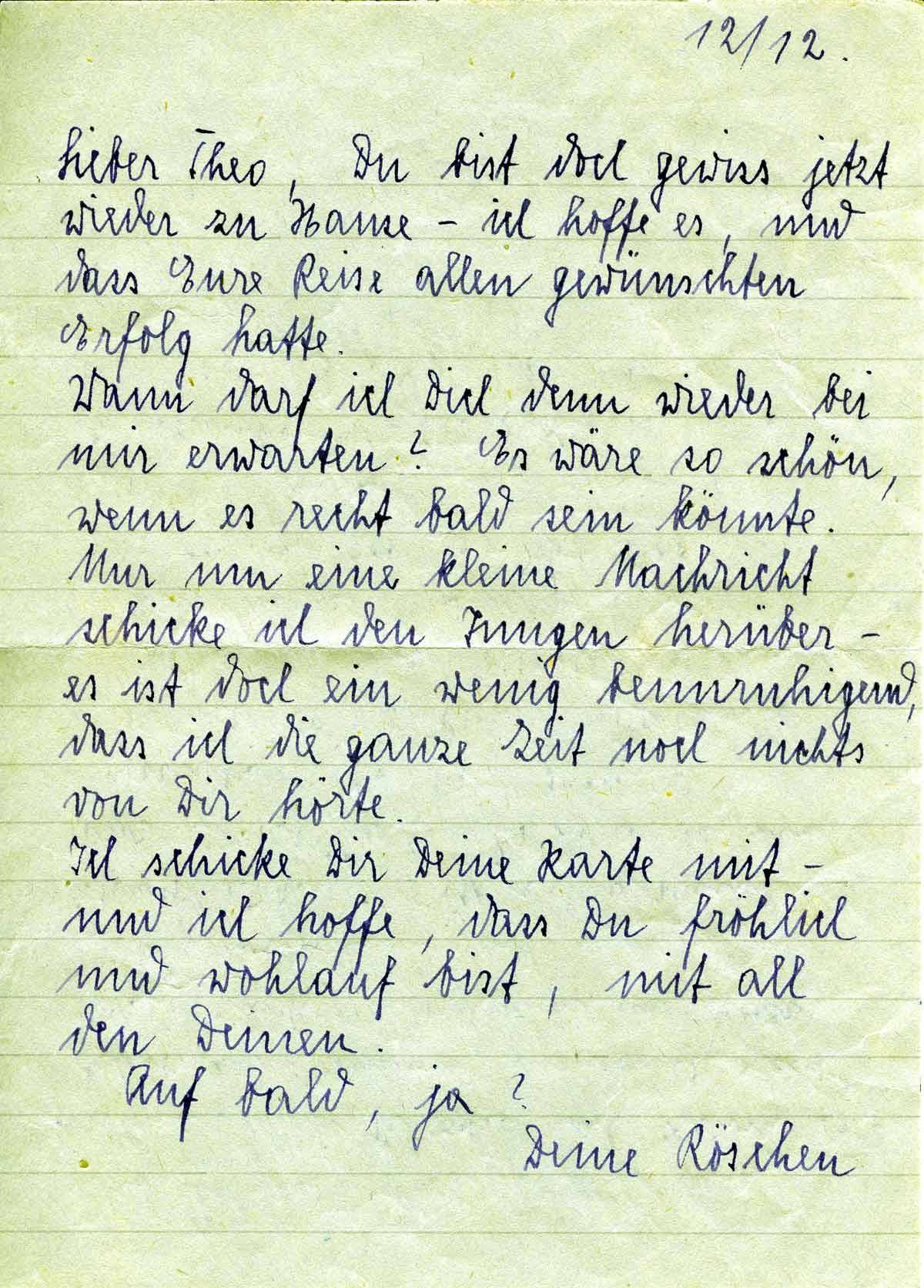 Hab Dank für Dein Brieflein. Habe Dir gestern durch Karin telefonieren lassen, scheinbar ohne Erfolg. Also, ich komme heute zu der verabredeten Zeit, hoffentlich passt es Dir; es ist ja dumm, dass ich Dich gestern nicht erreichen konnte.