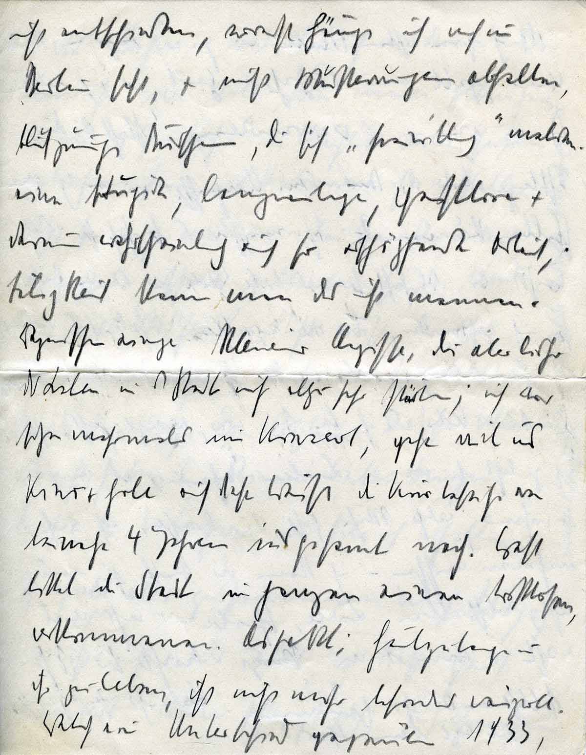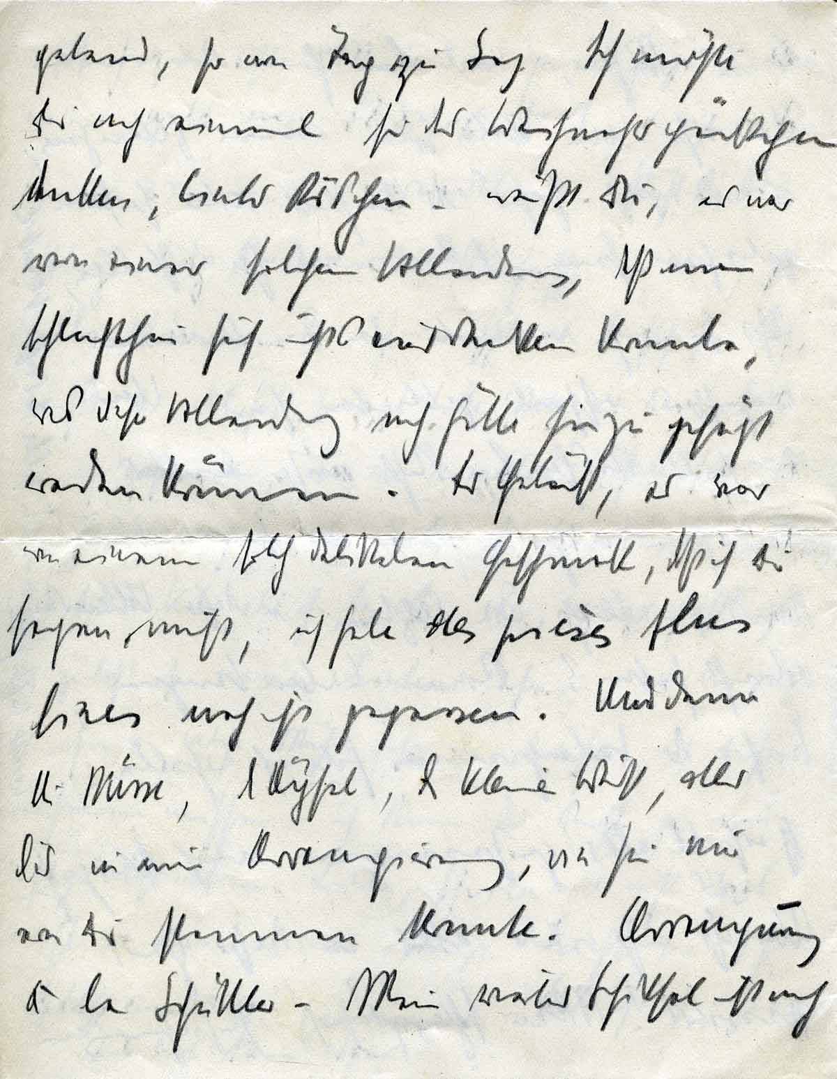 Ich möchte Dir noch einmal für das Weihnachtspäckchen danken, liebes Röschen – weißt Du, es war von einer solchen Vollendung, dass man schlechthin sich nicht ausdenken könnte, was dieser Vollendung und Fülle noch hätte hinzugefügt werden können. Das Gebäck, es war von einem solchen delikaten Geschmack, dass ich Dir sagen muss, ich habe des pièces plus fines noch nicht gegessen. Und dann die Nüsse, die Äpfel, die kleine Wurst, alles lieb in einer Arrangierung, wie sie nur von Dir stammen konnte. Arrangierung à la Schüttler.