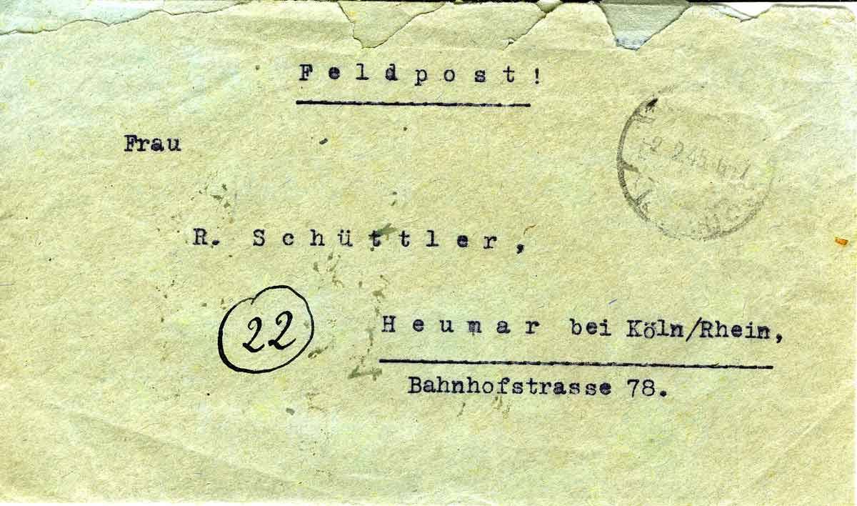 der versprochene zweite Brief folgt schneller als ich ihn Dir annoncierte. Ich bin überglücklich, Post von meinen Eltern gestern erhalten zu haben, und zwar noch gute Nachrichten. Du glaubst nicht, welches Glück ich beim Lesen dieses Briefes empfunden habe. Aber ich höre auch, dass Ihr in Heumar arg betroffen seid, mein Vater wollte von Nanna von der Lohe wissen, dass Dein Heim bei den Angriffen verschont geblieben war. Möge es der Wahrheit entsprechen – und möge Gottes gnädige Hand weiter Euch behüten!