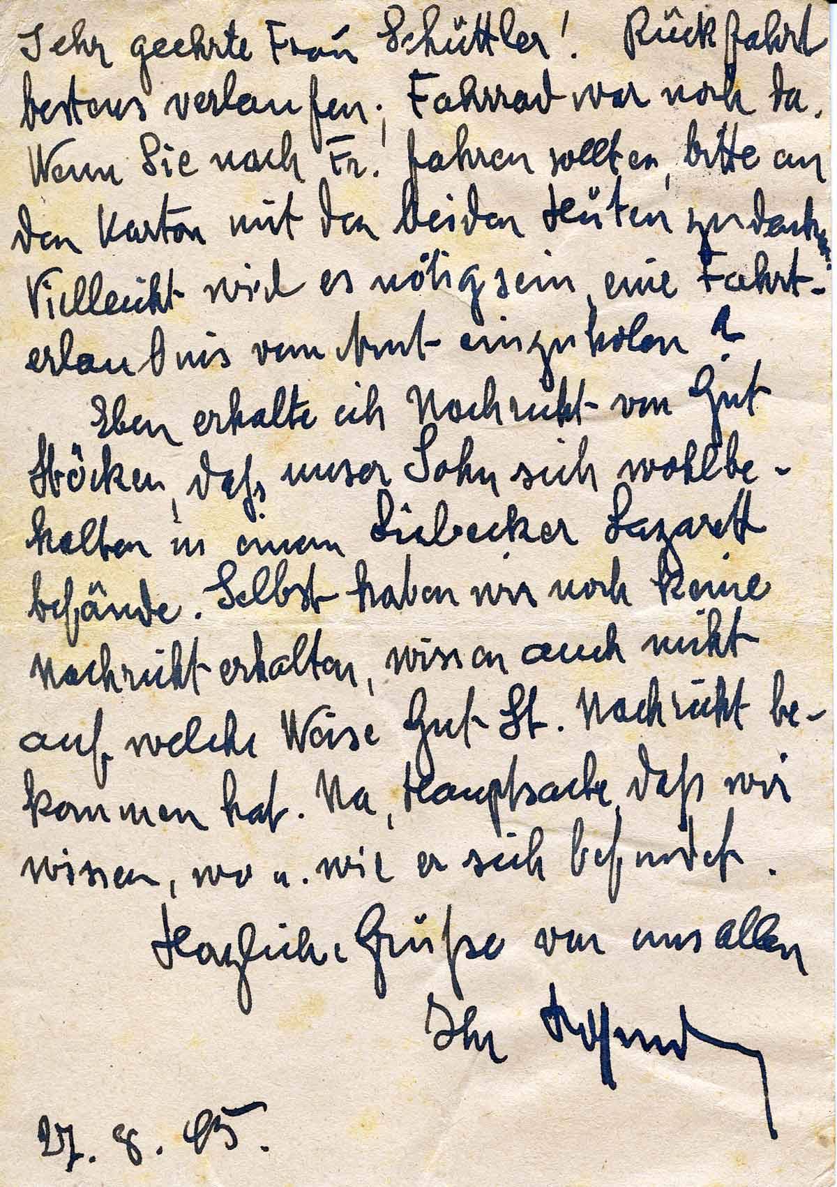 Eben erhalten wir die Nachricht von Gut Stöcken, dass unser Sohn sich wohlbehalten in einem Lübecker Lazarett befände. Selbst haben wir noch keinen Nachricht erhalten, wissen auch nicht auf welche Weise Gut Stöcken Nachricht bekommen hat. Na, Hauptsache, dass wir wissen, wo und wie er sich befindet.