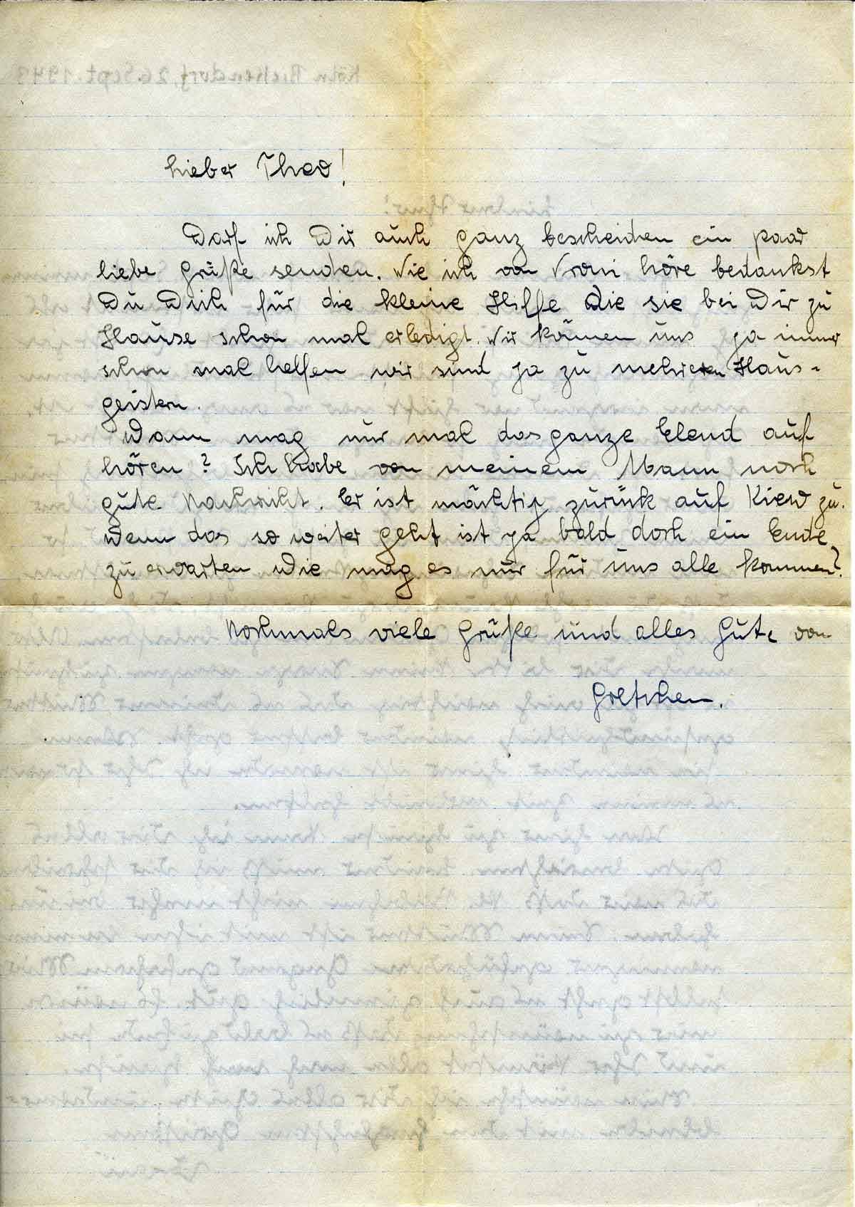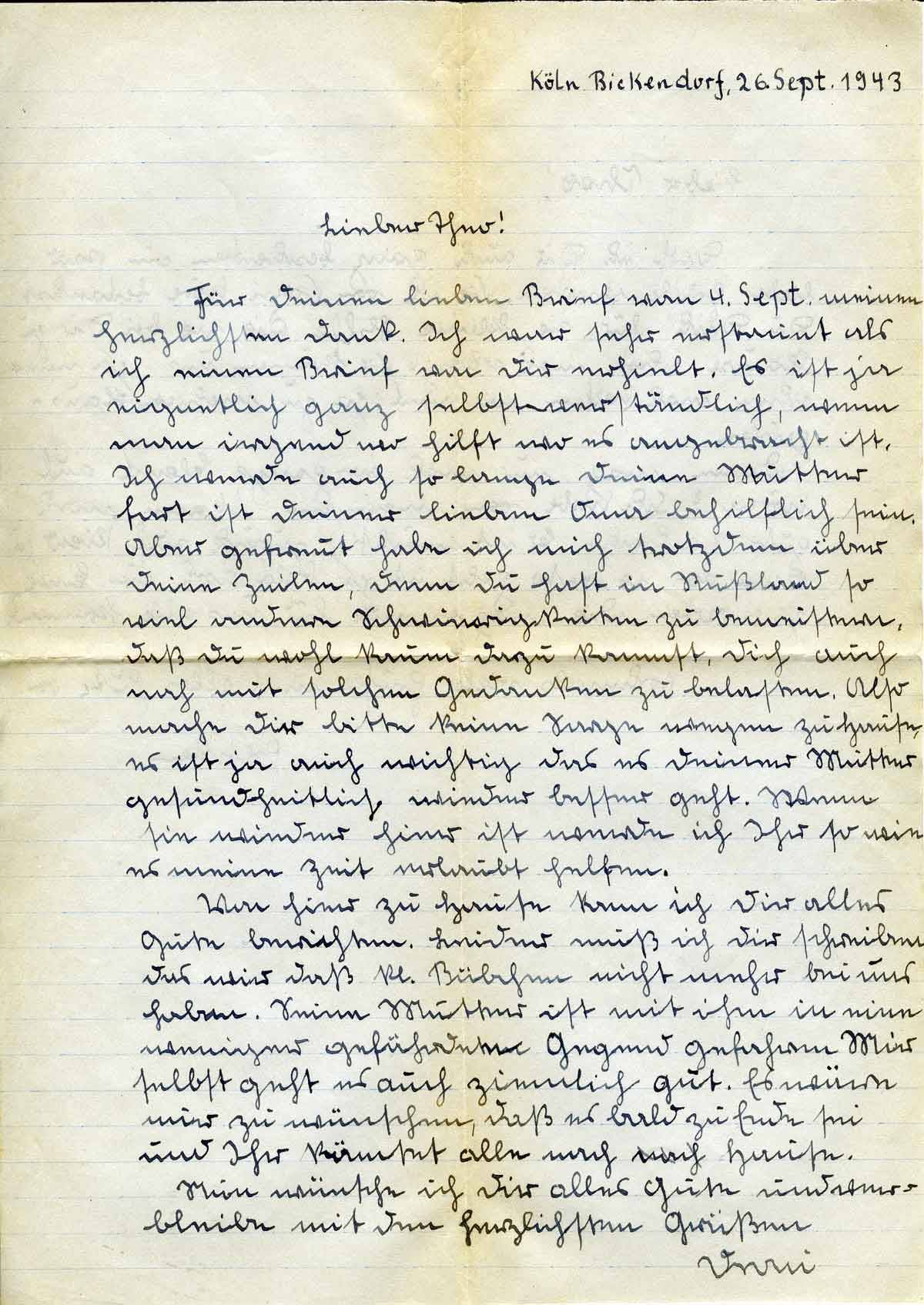Für Deinen lieben Brief vom 4. Sept. meinen herzlichsten Dank. Ich war sehr erstaunt als ich einen Brief von Dir erhielt. Es ist ja eigentlich ganz selbstverständlich, wenn man irgend wo hilft wo es angebracht ist. Ich werde auch so lange Deine Mutter fort ist Deiner lieben Oma behilflich sein. Aber gefreut habe ich mich trotzdem über Deine Zeilen, denn Du hast in Rußland so viel andere Schwierigkeiten zu bemeistern, daß Du wohl kaum dazu kommst, Dich auch noch mit solchen Gedanken zu belasten. Also mache Dir bitte keine Sorge wegen zu Hause, es ist ja auch wichtig das es Deiner Mutter gesundheitlich wieder besser geht. Wenn sie wieder hier ist werde ich Ihr so wie es meine Zeit erlaubt helfen.