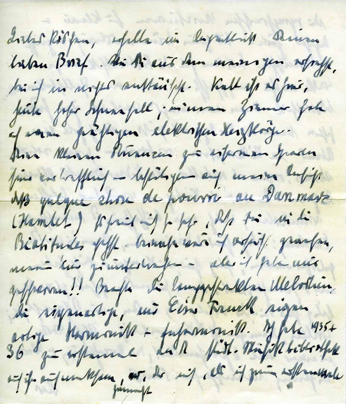 Deine kleinen Nuancen[?] zu eisernen Sparen sind vortrefflich – bestätigen auch meine Ansicht daß quelque chose de pourri au Danmark (Hamlet). Es freut mich so sehr, daß Du in die Biatitudes gehst. Beinahe wäre ich [..] gewesen, meine Kur zu unterbrechen – aber ich habe mir geschworen!! Brachte die langgestreckten Melodien, die eigenartige, nur César Frank eigen artige Harmonik + [..]harmonik. Ich habe 1935 + 36 zum erstenmal die städt. Musikbibliothek auf ihn aufmerksam gemacht, er, der mich, als ich zum ersenmale