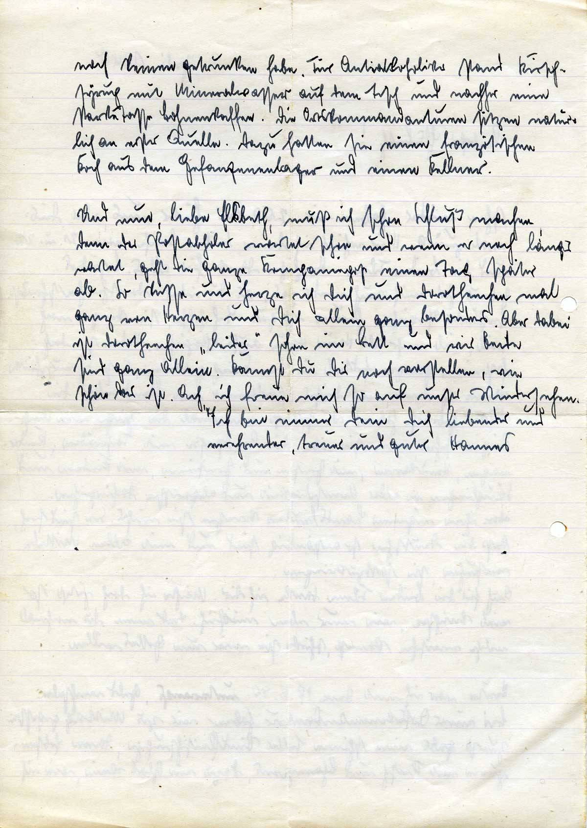Und nun, liebe Elsbeth, muß ich schon Schluß machen, denn der Postabholer wartet schon und wenn er noch länger wartet, geht die ganze Kompaniepost einen Tag später ab. So küsse und herze ich Dich und Dorotheechen mal ganz von Herzen und Dich allein ganz besonders. Aber dabei ist Dorotheechen „leider“ schon im Bett und wir beide sind ganz allein. Kannst Du Dir noch vorstellen, wie schön das ist. Ach, ich freue mich so auf unser Wiedersehen.