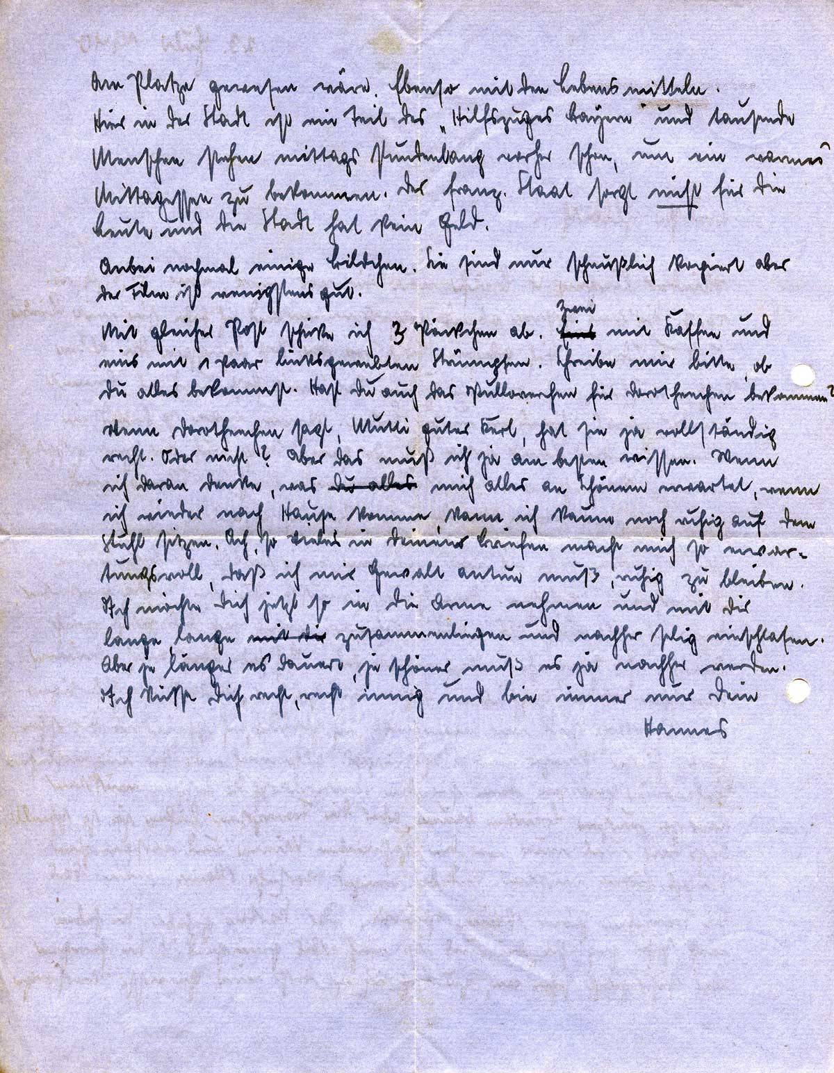 Wieder liegen 4 Briefe von Dir vor mir, vom 7., 8., 9. u. 17. 7. Sie sind gestern abend angekommen und ich habe sie mit Liebe und Freude an Dich gelesen. Jetzt, wo die Post langsam die alten Sachen aufholt, rechnet man jeden Tag mit Post und es kommt wieder etwas Schönes in unser Leben. Wenn man so fremd in einem fremden Land sitzt, ist der ganze Tag auf die Zeit gespitzt, wo man Nachricht von Zuhause bekommt. Auch die Filme und Zigaretten, von denen Du schreibst, habe ich erhalten.