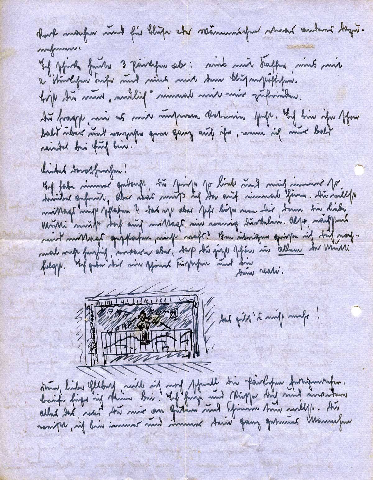 Ich habe immer gedacht, Du seiest so lieb und mich immer so darüber gefreut. Aber was muß ich da auf einmal hören. Du willst mittags nicht schlafen? Das ist aber sehr böse von Dir, denn die liebe Mutti muß doch auch mittags ein wenig duckelen. Also, nächstens wird mittags geschlafen, nicht wahr? Im übrigen grüße ich Dich nochmal recht herzlich, erwarte aber, daß Du jetzt schön in allem der Mutti folgst. Ich gebe Dir ein schönes Küßchen und bin Dein Vati.
