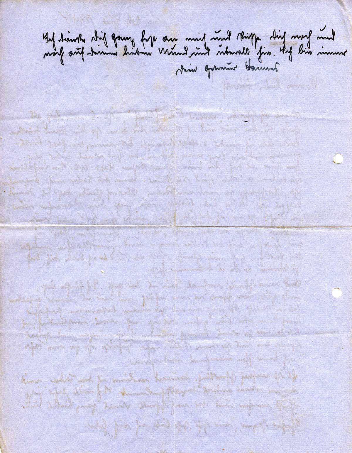 Es ist einfach schrecklich. Dauernd verliere ich den Faden weil immer etwas anderes dazwischenkommt. Ich will daher jetzt Schluß machen und Dir noch schnell etwas ganz Liebes ins Öhr- chen sagen, wie sehr, sehr lieb ich Dich habe.