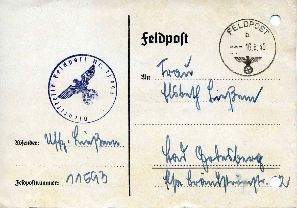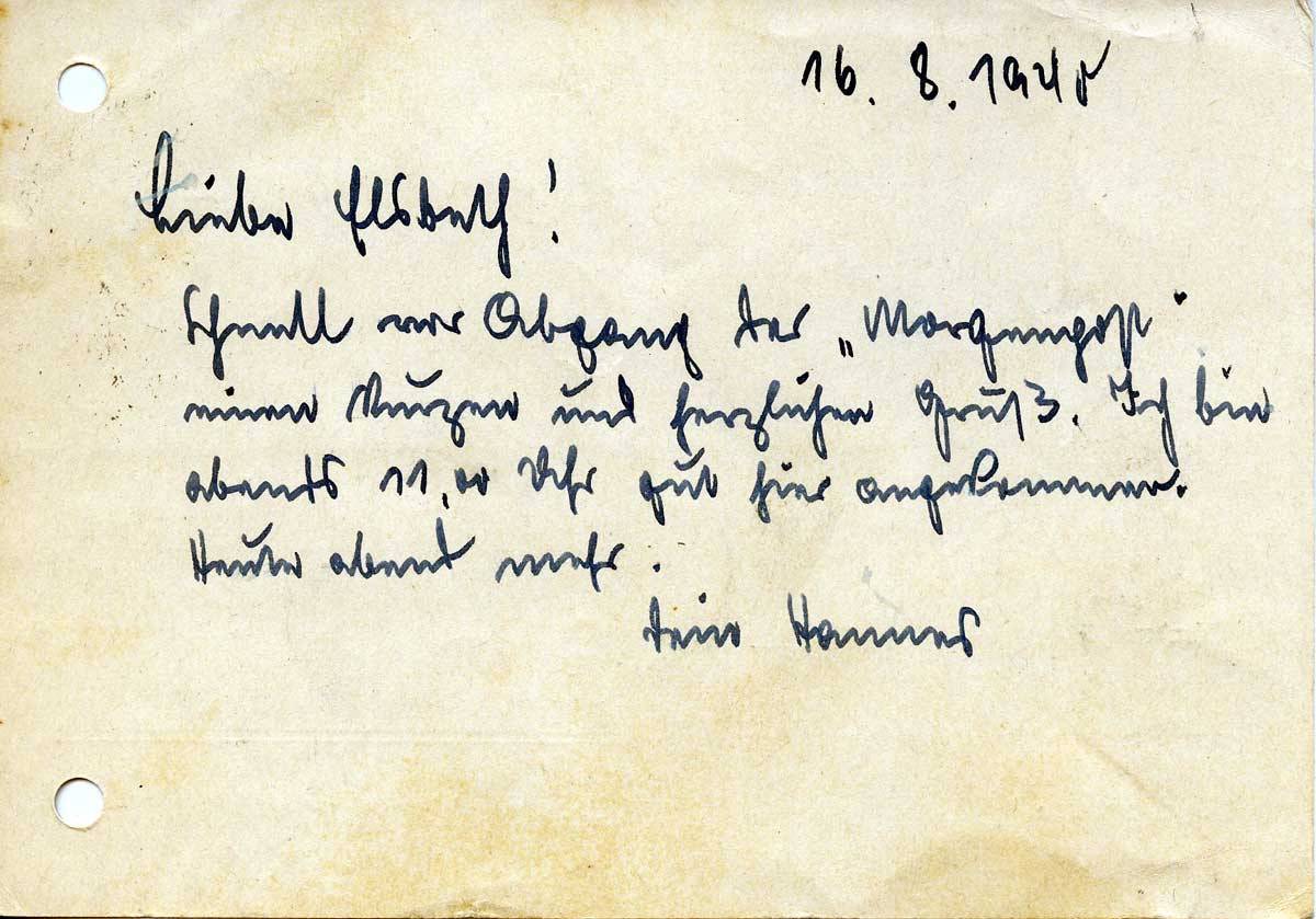 Johannes Ließem an seine Frau Elsbeth, 16 August 1940 16.8.1940 Liebe Elsbeth! Schnell vor Abgang der „Morgenpost“ einen kurzen und herzlichen Gruß. Ich bin abends 11.00 Uhr gut hier angekommen. Heute abend mehr. Dein Hannes