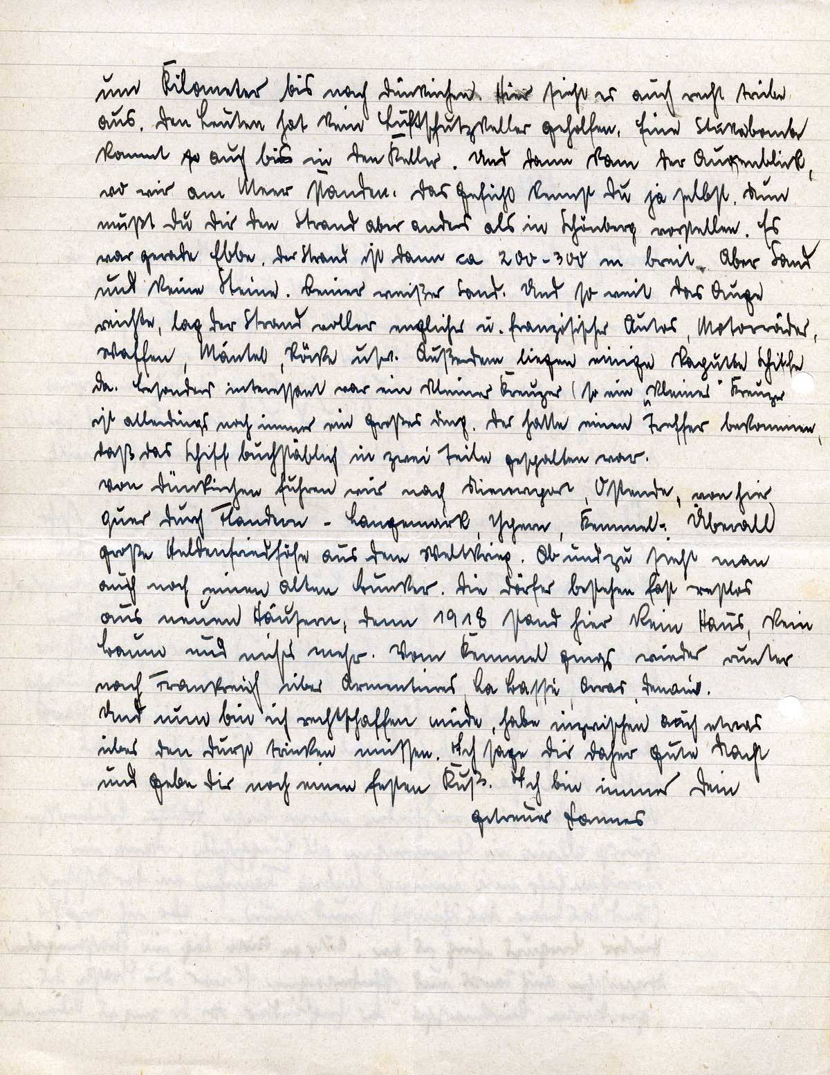 Herzlichen Dank für Deine beiden Briefe. Immer ist es einem ein Stück von der Heimat und man vergißt überm Lesen einen Augenblick den ganzen Krieg, allen Ärger und Unannehmlichkeiten und da ist mit den Gedanken ganz bei Frauchen. So küsse ich Dich denn zum Anfang auf Deinen lieben Mund und sage Dir noch schnell, daß ich Dich ganz ganz lieb habe. An den Zaunpfahl will ich denken.