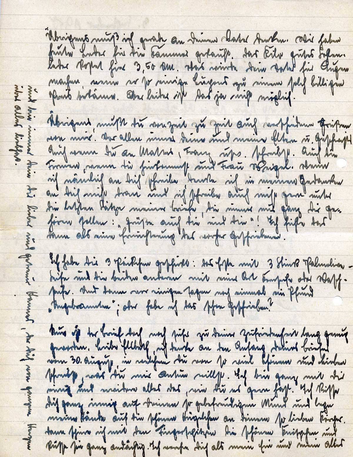 Übrigens, mußt Du von Zeit zu Zeit auch verschiedene grüßen von mir. Vor allen immer Deine und meine Eltern u. Geschwister. Auch wenn Du an Mattes, Franz usw. schreibst. Auch die Firmen, wenn Du hinkommst und Frau Weigel [Nachbarin der Eltern]. Wenn ich nämlich an Dich schreibe, denke ich in meinen Gedanken an Dich nicht dran und ich schreibe auch nicht gern unter die letzten Sätze meiner Briefe, die immer nur ganz Dir gehören sollen: „Grüße auch die und die!“ Ich fühle das dann als eine Ernüchterung des vorher Geschriebenen.
