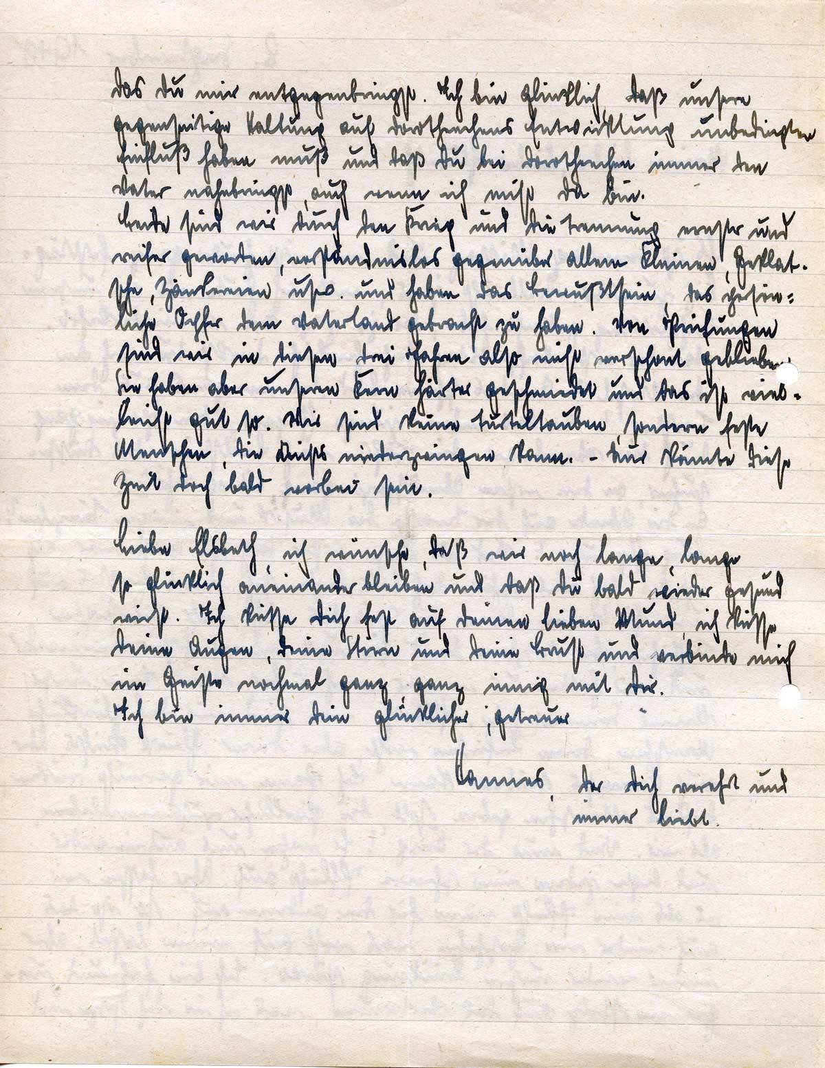 Beide sind wir durch den Krieg und die Trennung ernster und reifer geworden, verständnislos gegenüber allem Kleinen, Geklatsche, Zänkereien usw. und haben das Bewußtsein, das persönliche Opfer dem Vaterland gebracht zu haben. Von Prüfungen sind wir in diesen drei Jahren also nicht verschont geblieben. Sie haben aber unseren Kern härter geschmiedet und das ist vielleicht gut so. Wir sind keine Turteltauben, sondern feste Menschen, die Nichts niederzwingen kann. - Nur könnte diese Zeit doch bald vorbei sein.