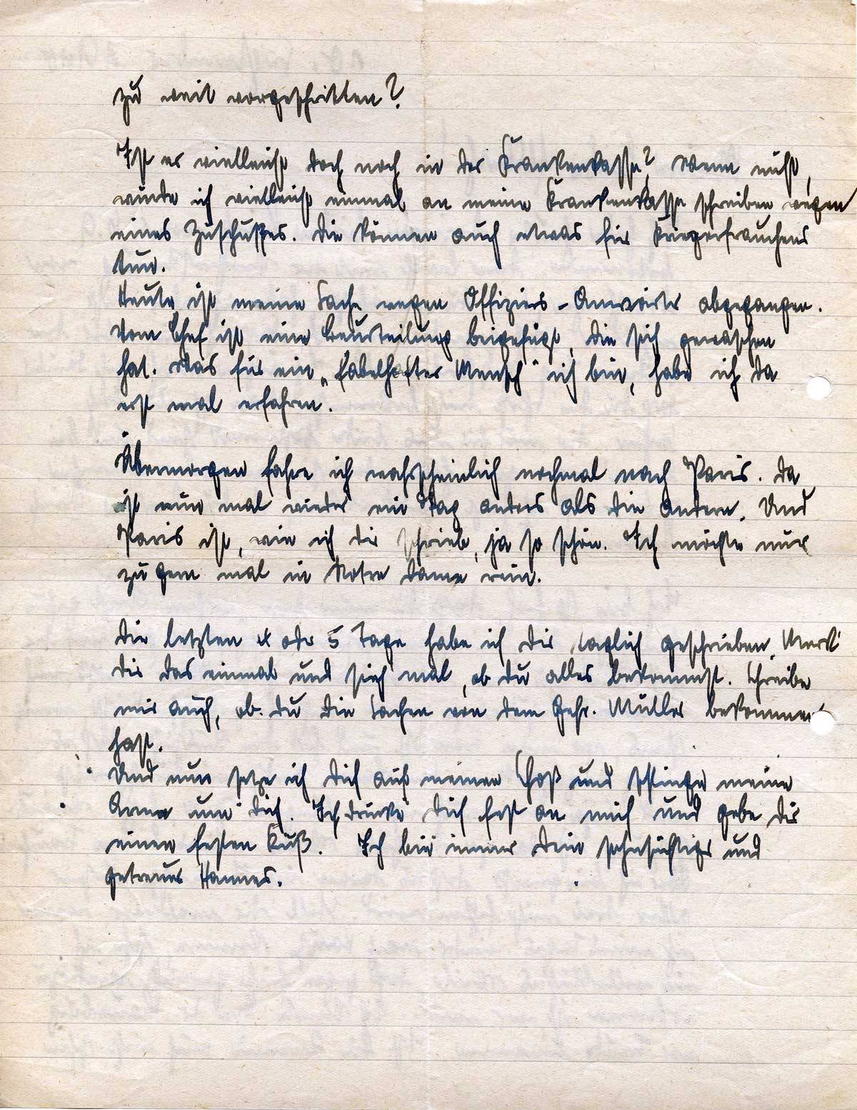 Die letzten 4 oder 5 Tage habe ich Dir täglich geschrieben. Merk' Dir das einmal und sieh mal, ob Du alles bekommst. Schreibe mir auch, ob Du die Sachen von dem Gefr. Müller bekommen hast.