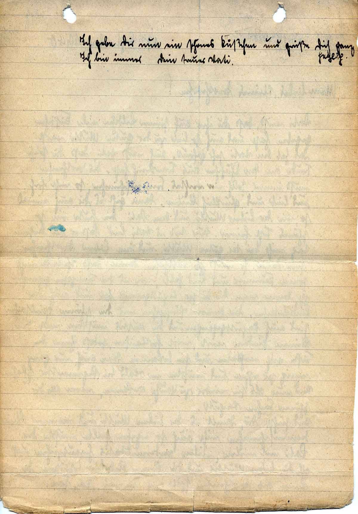 Vati weiß, daß Du ihm auf seinem Bildchen viele Küßchen gegeben hast und auch so lieb zu der guten Mutti warst. Das hat den Vati sehr gefreut. Auch weiß Vati, daß Du solche Freude an den Schühchen aus Frankreich hast. Das Dorotheechen muß immer solch ein rechtes Sonnenscheinchen, so recht froh und lieb und glücklich bleiben. Dann geht es Dir auch einmal so, wie der lieben Mutti und dem Vati, die heute ein so schönes Fest feiern. Nur tut es Vati leid, daß er an diesem Tag nicht bei der guten Mutti und dem lieben Dorotheechen sein kann. Er muß ja mithelfen daran, daß Ihr beide nicht soviel Kummer und Leid habt, wie es den Franzosen gegangen ist, denen man die Häuser kaputtgemacht hat und auch die Kinderbettchen, die armen Püppchen und die schönen Spielsachen sind auch kaputtgegangen und die Muttis mußten mit den kleinen Kindern weit, weit fortlaufen, sodaß ihnen die Füße arg wehtaten und sie bekamen dann auch nur ganz wenig zu essen und mußten im Wald bei Regenwetter schlafen. Und nun, als sie wieder zu Hause ankamen, waren alle die schönen Sachen kaputt.