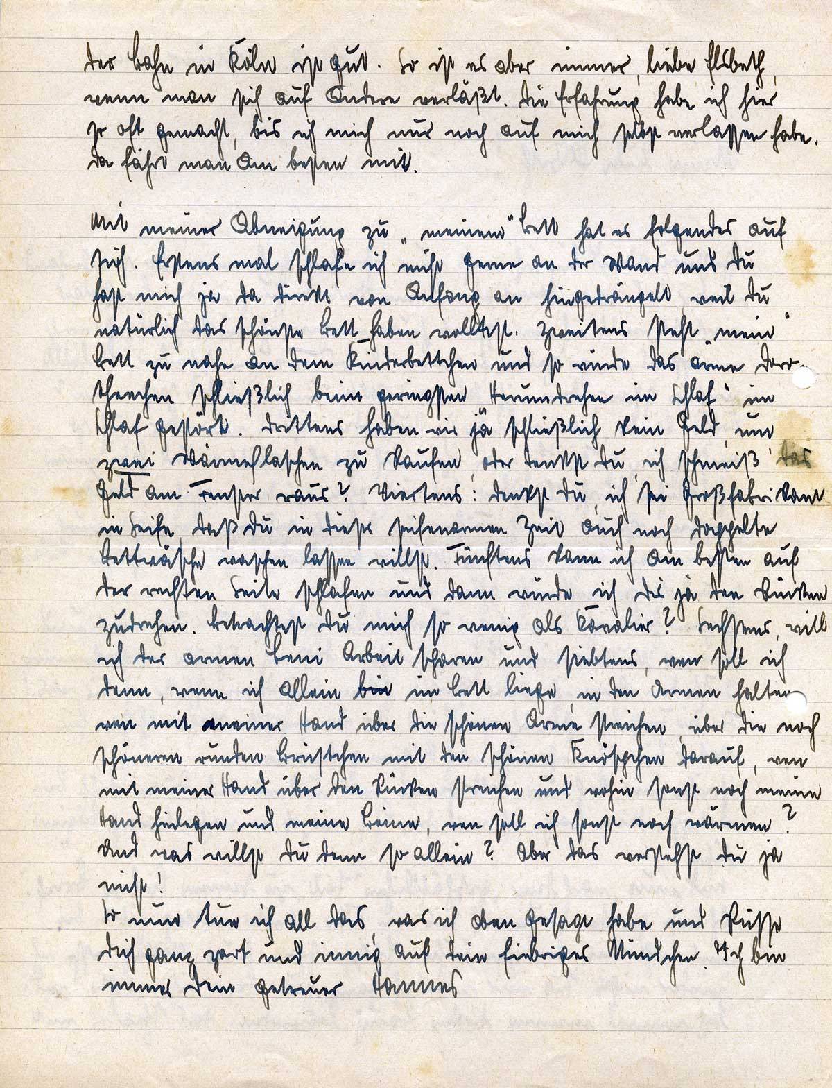 Mit meiner Abneigung zu „meinem“ Bett hat es folgendes auf sich. Erstens mal schlafe ich nicht gerne an der Wand und Du hast mich ja da direkt von Anfang an hingedrängelt, weil Du natürlich das schönste Bett haben wolltest. Zweitens steht „mein“ Bett zu nahe an dem Kinderbettchen und so würde das arme Dorotheechen schließlich beim geringsten „Herumdrehen im Schlaf“ im Schlaf gestört. Drittens haben wir ja schließlich kein Geld, um zwei Wärmeflaschen zu kaufen, oder denkst Du, ich schmeiß' das Geld zum Fenster raus? Viertens: Denkst Du, ich sei Großfabrikant in Seife, daß Du in dieser seifenarmen Zeit auch noch doppelte Bettwäsche waschen lassen willst. Fünftens kann ich am besten auf der rechten Seite schlafen und dann würde ich Dir ja den Rücken zudrehen. Betrachtest Du mich so wenig als Kavalier? Sechstens, will ich der armen Leni Arbeit sparen und siebtens, wen soll ich denn, wenn ich allein bin im Bett liege, in den Armen halten, wen mit meiner Hand über die schönen Arme streichen, über die noch schöneren runden Brüstchen mit den schönen Knöspchen darauf, wen mit meiner Hand über den Rücken streichen und wohin sonst noch meine Hand hinlegen und meine Beine, wen soll ich sonst noch wärmen? Und was willst Du denn so allein? Aber das verstehst Du ja nicht!