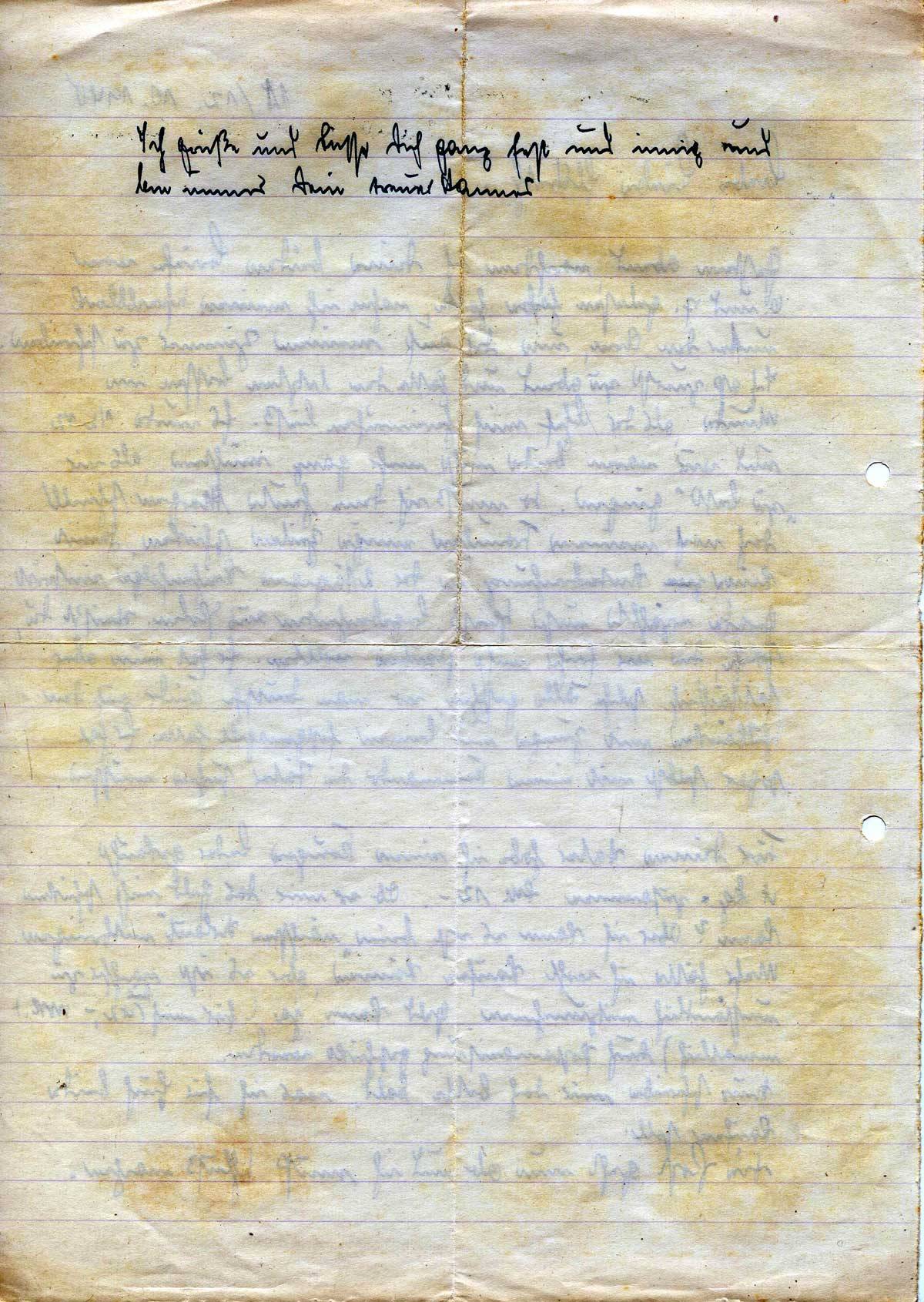 Gestern abend, nachdem ich Deine beiden Briefe vom 6. und 7. gelesen habe hatte, nahm ich meinen Schreibblock unter den Arm, um Dir auf meinem Zimmer zu schreiben. Ich aß zuerst zu abend und hatte den letzten Bissen im Munde, als der Chef mich hereinrufen ließ. Es wurde 1/2 12 und wir waren beide nicht mehr ganz nüchtern, als wir „zu Bett“ gingen. So muß ich denn heute Morgen schnell doch noch meinem Frauchen einige Zeilen schicken, damit keine Unterbrechung in der 2tägigen Reihenfolge eintritt. Gerade erzählte unser Spieß Begebenheiten aus Polen. Weißt Du, solche, die wir früher nicht glauben wollten. Er hat nun aber tatsächlich solche Fälle gesehen, wo man deutsche Kinder auf den Schulbänken mit Zunge und Beinen festgenagelt hatte. Er hat sogar selbst mit einem Kommando die Täter suchen müssen.