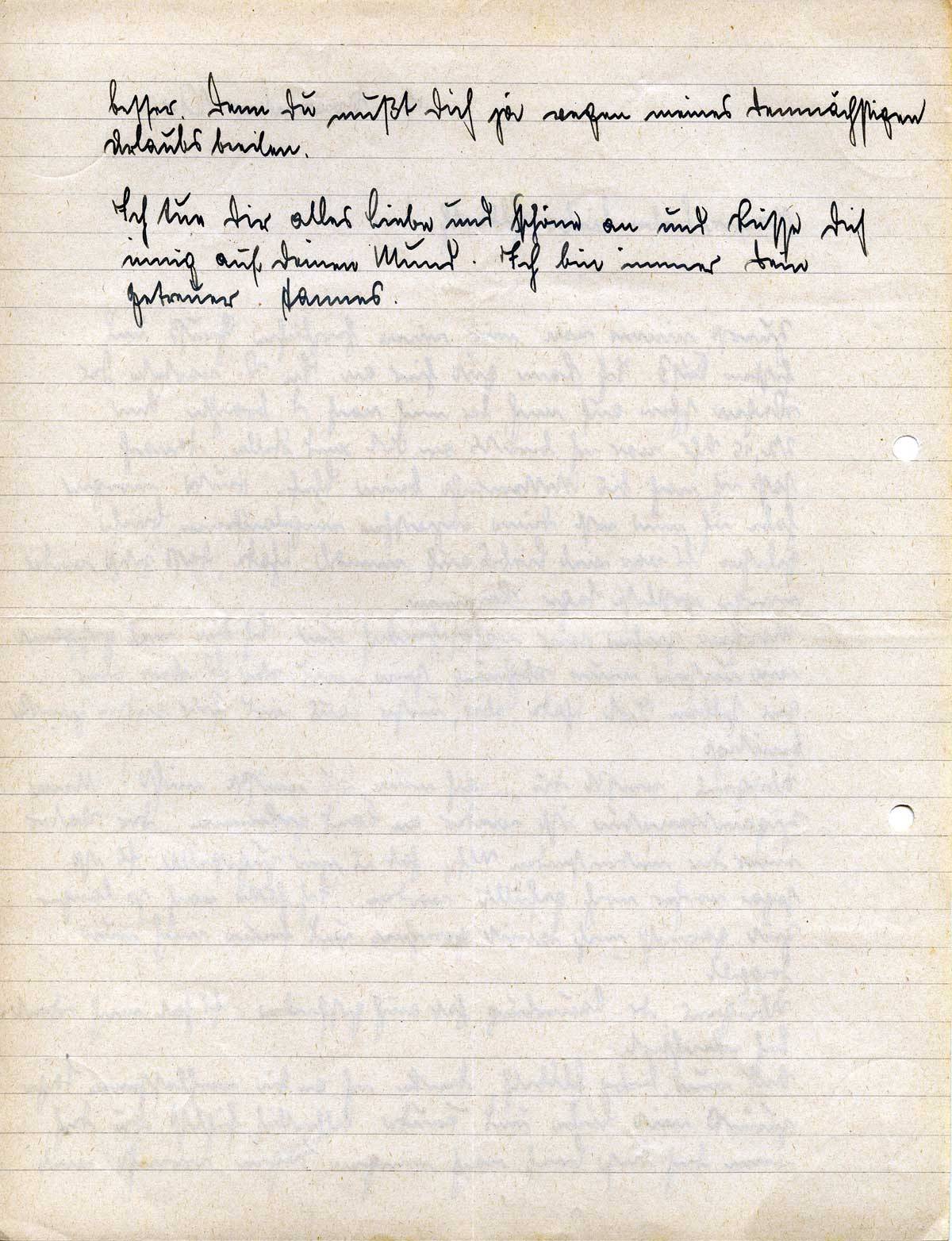 Zuerst nimm von mir einen herzlichen Gruß und festen Kuß. Ich kam gut hier an. In V. wartete der Wagen schon auf mich, der mich nach D. brachte. Um 22,15 Uhr war ich bereits an Ort und Stelle. Danach saß ich noch bis Mitternacht beim Chef. Heute morgen habe ich nun erst Deine inzwischen eingelaufenen Briefe gelesen. Es war viel Liebes auf einmal. Schade, daß jetzt wieder einige postlose Tage kommen.