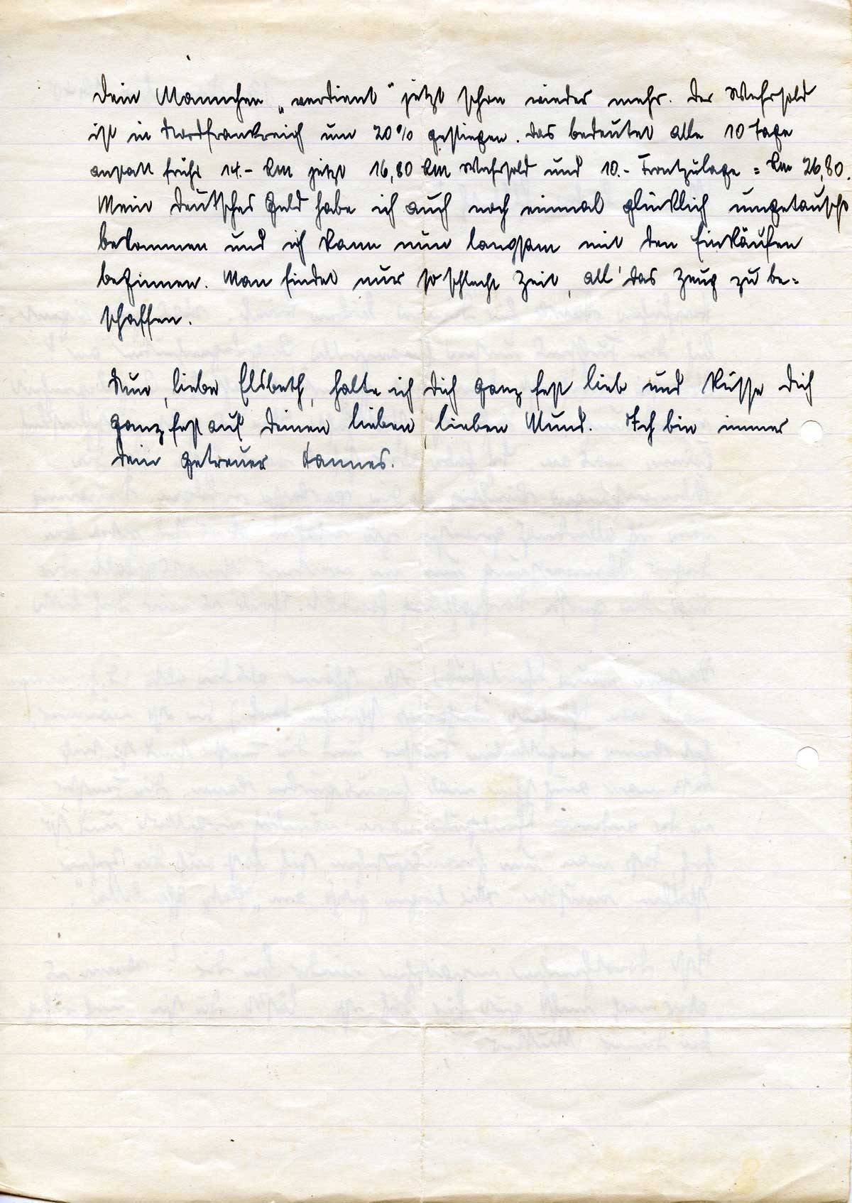 Herzlichen Dank für Deinen lieben Brief. Was gibt [geht] eigentlich die Fuchsens [die Nachbarn sind NSDAP-Mitglieder] unsere finanzielle Angelegenheiten an! Aber sei unbesorgt,