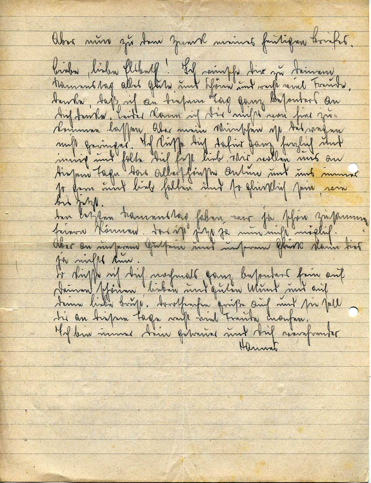Liebe, liebe Elsbeth! Ich wünsche Dir zu Deinem Namenstag alles Gute und Schöne und recht viel Freude. Denke, daß ich an diesem Tage ganz besonders an Dich denke. Leider kann ich Dir nichts von hier zukommen lassen. Aber mein Wünschen ist deswegen nicht geringer. Ich küsse Dich dafür ganz herzlich und innig und halte Dich fest lieb. Wir wollen uns an diesem Tag das Allerschönste antun und uns immer so gern und lieb halten und so glücklich sein, wie bis jetzt. Den letzten Namenstag haben wir ja schön zusammen feiern können. Das ist jetzt ja nun nicht möglich. Aber an unserem Gutsein und unserem Glück kann dies ja nichts tun.