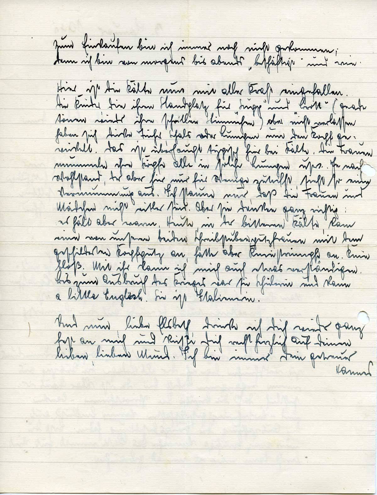 Hier ist die Kälte nun mit aller Kraft eingefallen. Die Kinder, die ihren Standplatz für „Supp“ und „Brott“ (grade tönen wieder ihre schrillen Stimmchen) aber nicht verlassen, haben sich dicke Tücher, Schals oder Lumpen um den Kopf gewickelt. Das ist überhaupt typisch hier bei Kälte. Die Frauen mummeln ihre Köpfe alle in solche Lumpen usw. Je nach Wohlstand, der aber hier nur für Wenige zutrifft, sieht so eine Vermummung aus. Ich staune nur, daß die Frauen und Mädchen nicht eitler sind. Aber sie denken ganz richtig: es hält aber warm. Heute, in der bitteren Kälte, kam eine von unseren beiden Schreibstubenputzfrauen mit dem geschilderten Kopfputz an, hatte aber Kniestrümpfe an. Knie bloß. Mit ihr kann ich mich auch etwas verständigen. Bis zum Ausbruch des Krieges war sie Schülerin und kann a little English. Sie ist Italienerin.
