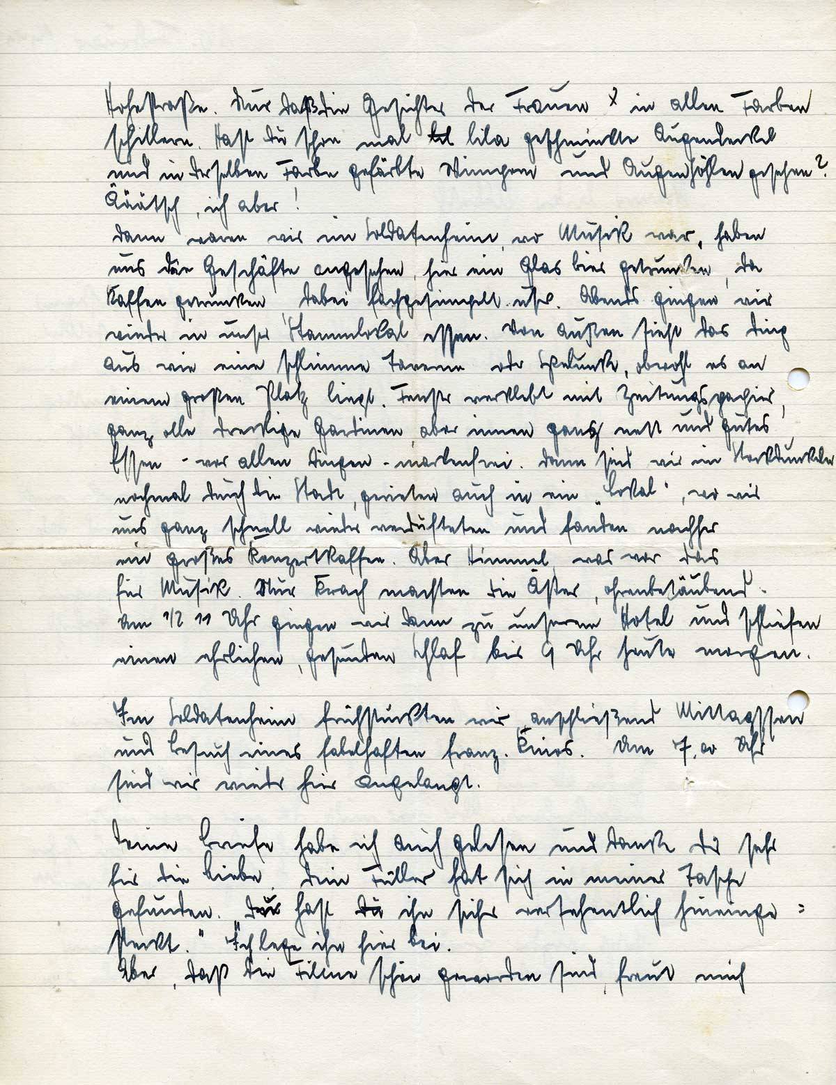 Dann waren wir im Soldatenheim, wo Musik war, haben uns die Geschäfte angesehen, hier ein Glas Bier getrunken, da Kaffee getrunken, dabei fachgesimpelt usw. Abends gingen wir wieder in unser Stammlokal essen. Von außen sieht das Ding aus wie eine schlimme Taverne oder Spelunke, obwohl es an einem großen Platz liegt. Fenster verklebt mit Zeitungspapier, ganz olle dreckige Gardinen, aber innen ganz nett und gutes Essen – vor allen Dingen – markenfrei. Dann sind wir im Starkdunkeln nochmal durch die Stadt, gerieten auch in ein „Lokal“, wo wir uns ganz schnell wieder verdufteten und fanden nachher ein großes Konzertkaffee. Aber Himmel, was war das für Musik. Nur Krach machten die Äster [rheinischer Ausdruck], ohrenbetäubend. Um ½11 Uhr gingen wir dann zu unserem Hotel und schliefen einen ehrlichen, gesunden Schlaf bis 9 Uhr heute morgen.
