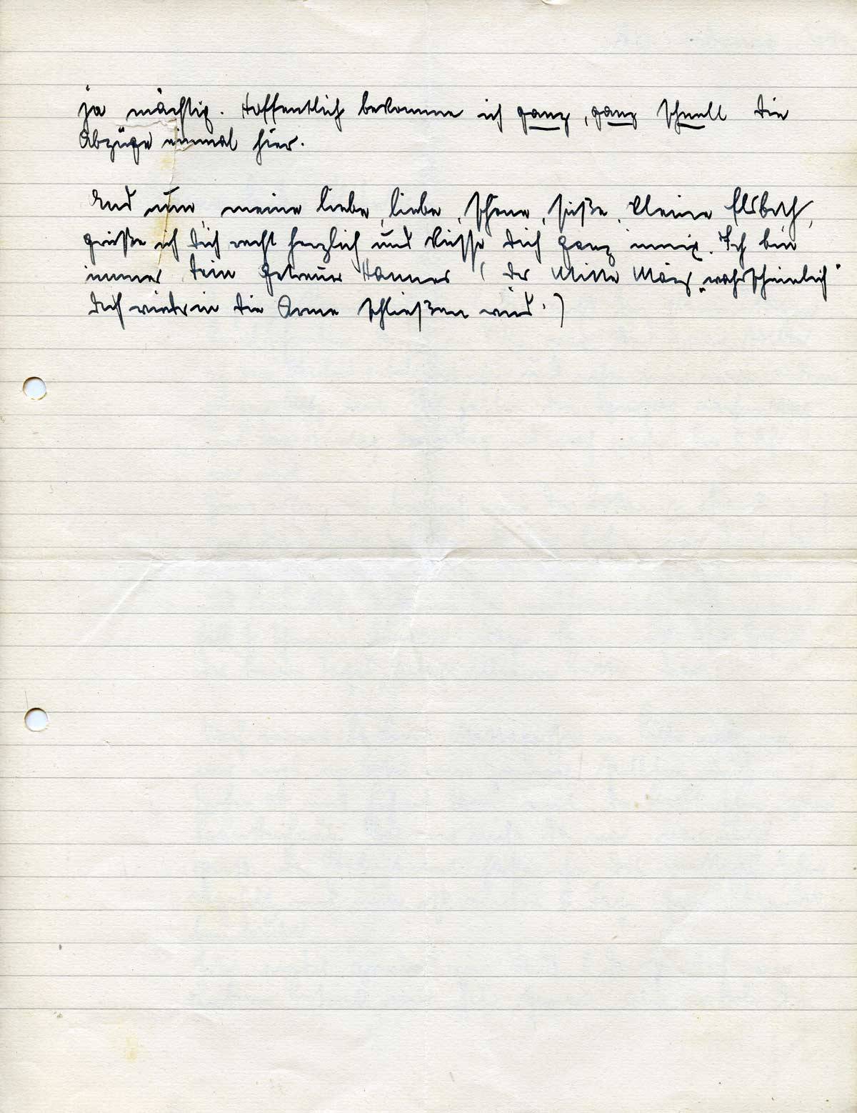 Und nun, meine liebe, liebe, schöne, süße, kleine Elsbeth, grüße ich Dich recht herzlich und küsse Dich ganz innig. Ich bin immer Dein getreuer Hannes (der Mitte März „wahrscheinlich“ Dich wieder in die Arme schließen wird.)