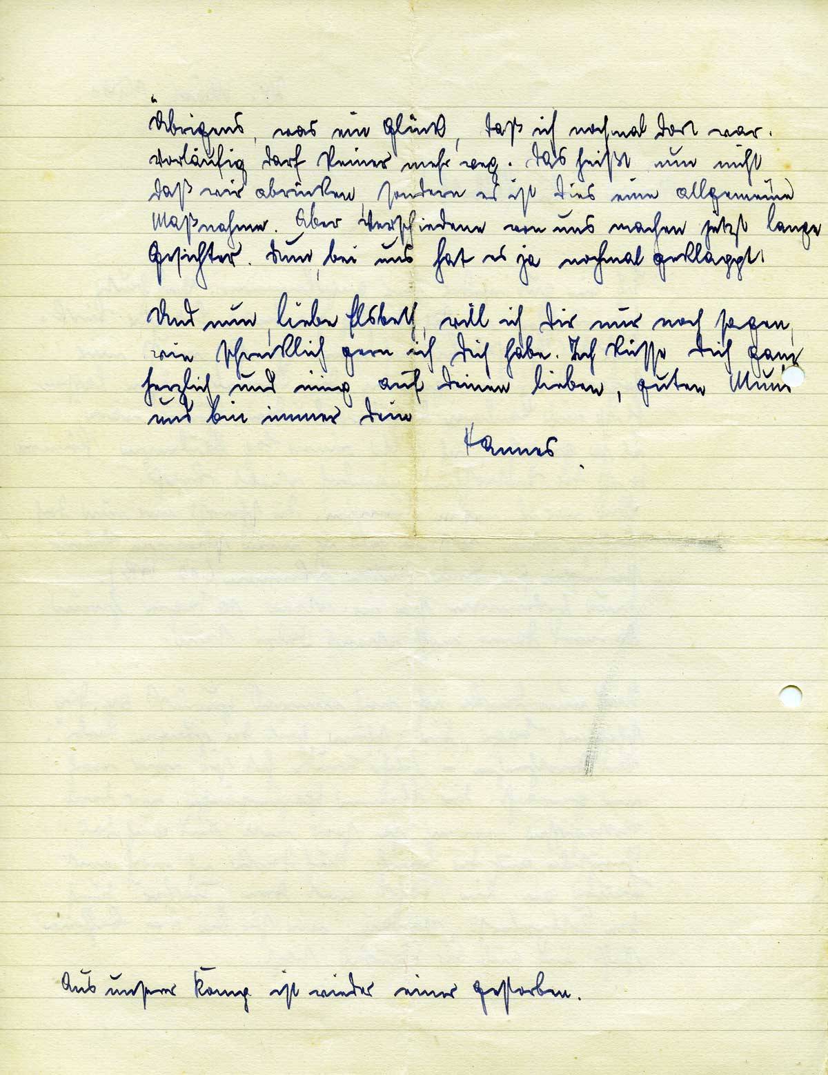 Übrigens, was ein Glück, daß ich nochmal dort war. Vorläufig darf keiner mehr weg. Das heißt nun nicht, daß wir abrücken, sondern es ist dies eine allgemeine Maßnahme. Aber Verschiedene von uns machen jetzt lange Gesichter. Nun, bei uns hat es ja nochmal geklappt.