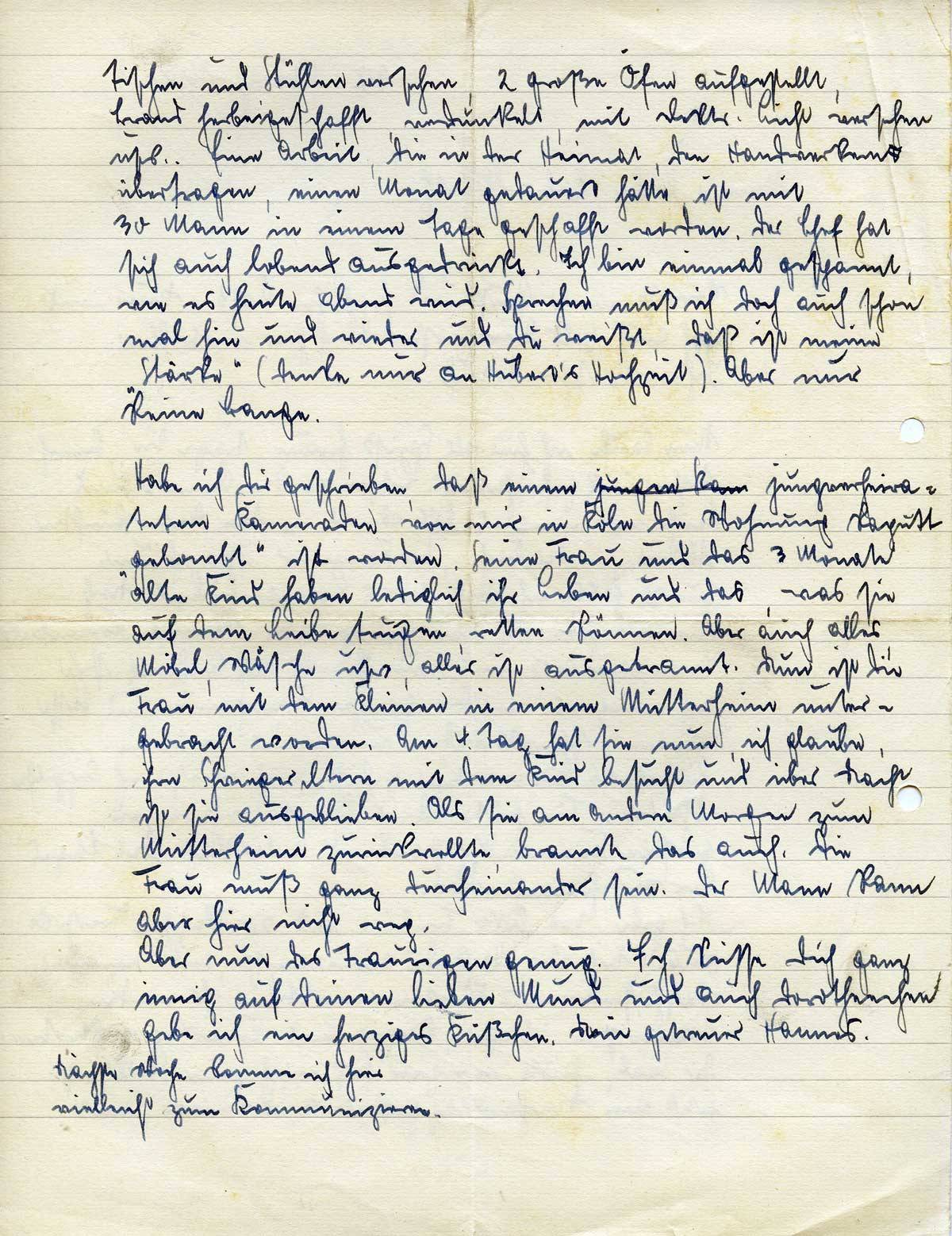 Habe ich Dir geschrieben, daß einem jungen Kam jungverheirateten Kameraden von mir in Köln die Wohnung kaputt „gebombt“ ist worden. Seine Frau und das 3 Monate alte Kind haben lediglich ihr Leben und das, was sie auf dem Leibe trugen, retten können. Aber auch alles, Möbel, Wäsche usw., alles ist ausgebrannt. Nun ist die Frau mit dem Kleinen in einem Mütterheim untergebracht worden. Am 4. Tag hat sie nun, ich glaube, ihre Schwiegereltern mit dem Kind besucht und über Nacht ist sie ausgeblieben. Als sie am andern Morgen zum Mütterheim zurückwollte, brannte das auch. Die Frau muß ganz durcheinander sein. Der Mann kann aber hier nicht weg.