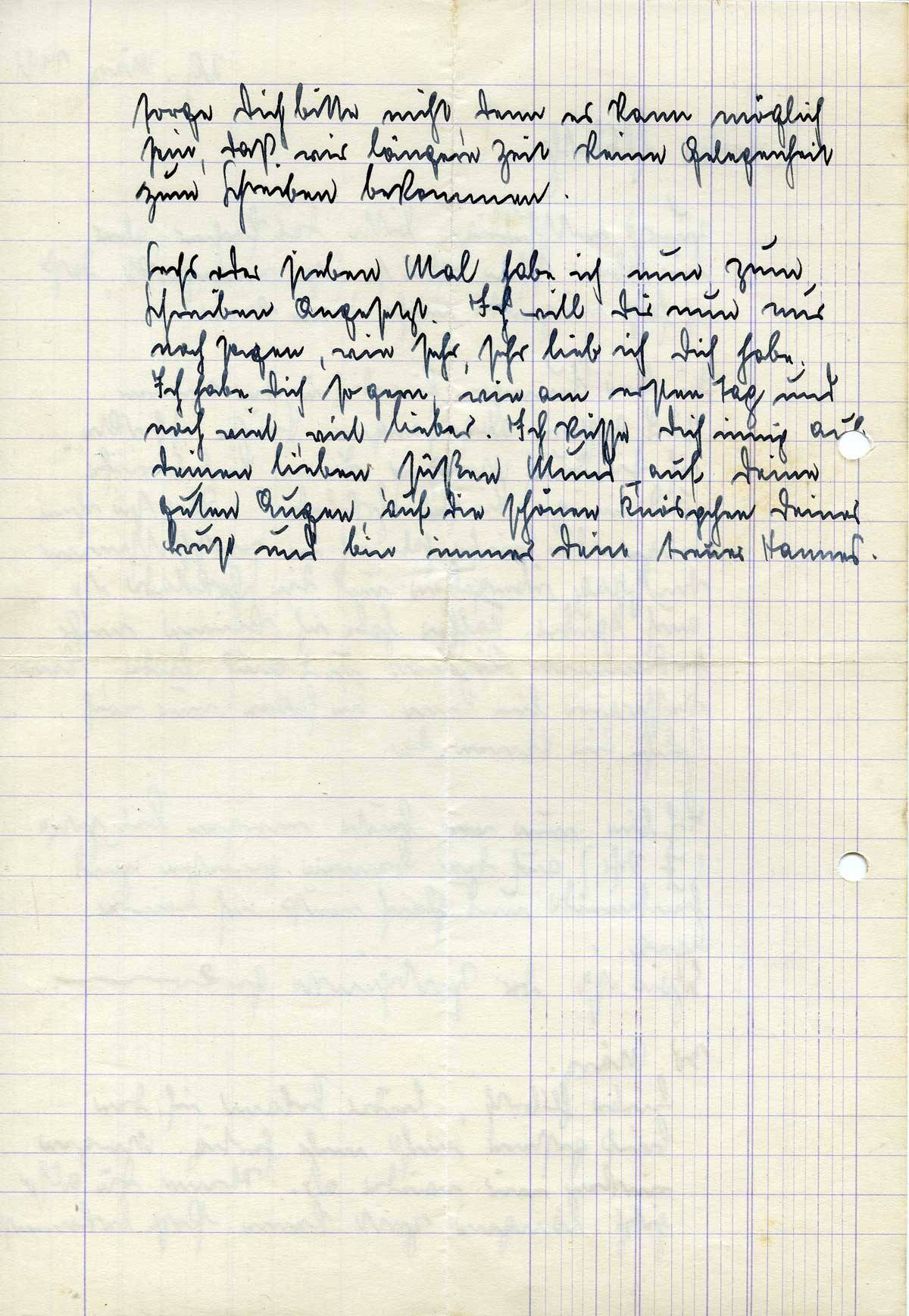 Sechs oder sieben Mal habe ich nun zum Schreiben angesetzt. Ich will Dir nun nur noch sagen, wie sehr, sehr lieb ich Dich habe. Ich habe Dich so gern, wie am ersten Tag und noch viel,